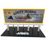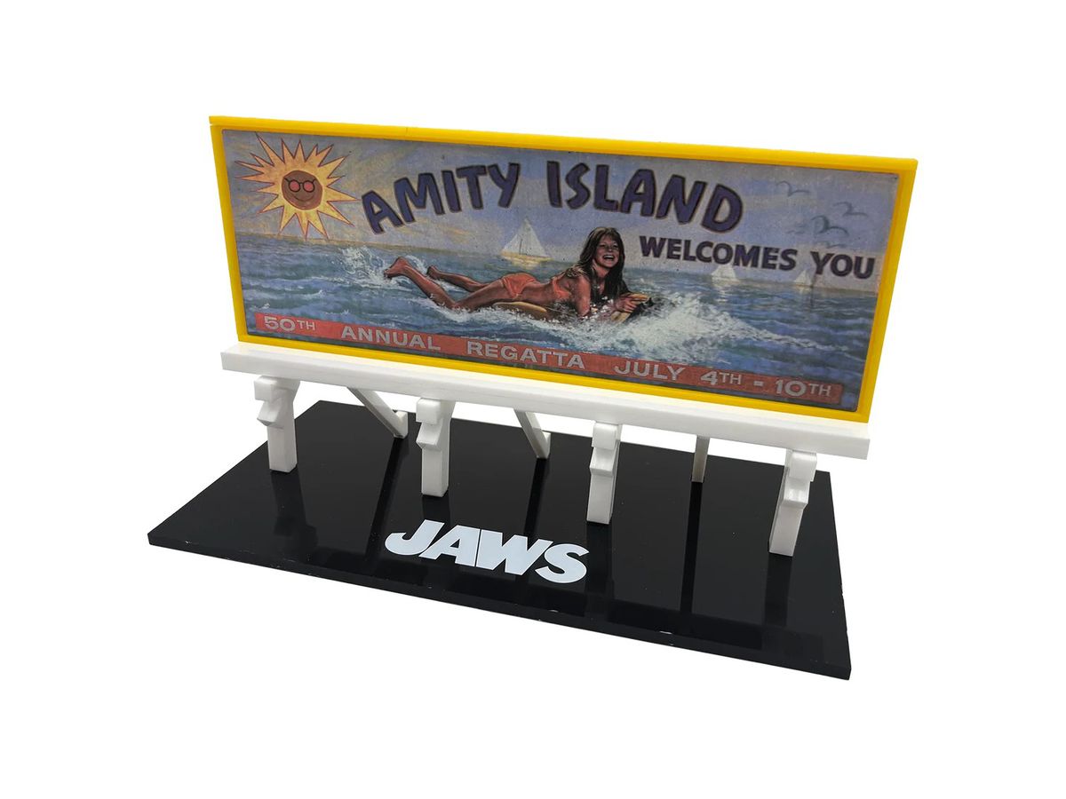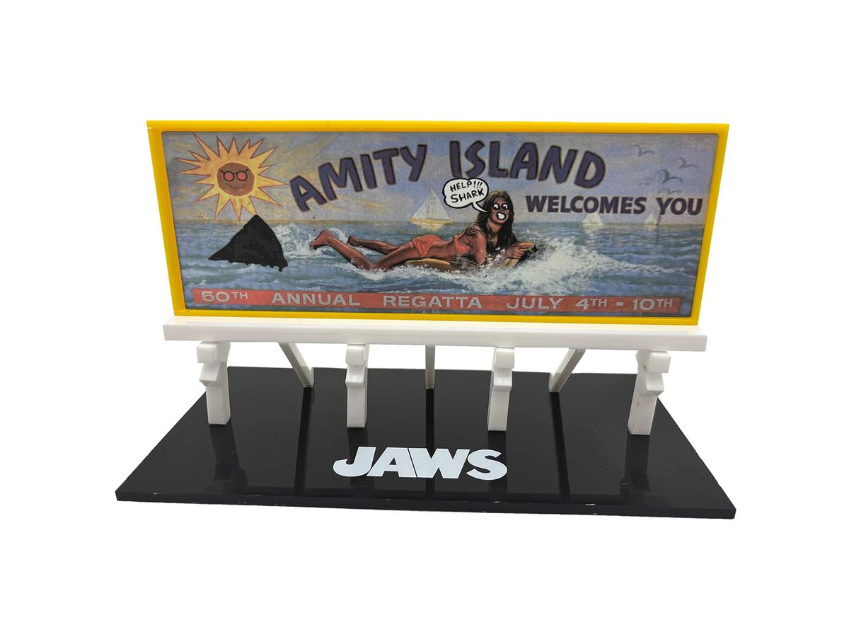 スティーヴン・スピルバーグの出世作とも言える1975年の映画『JAWS(ジョーズ)』から、アミティ島に野外掲載されていた立て看板を、全長約23センチで再現しました。強烈な日差し、プラス海風の影響もあったか、ほどよくくすんだ感まで!