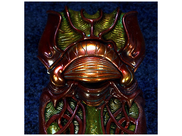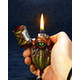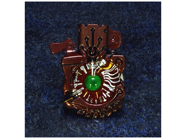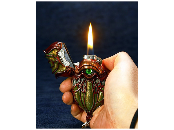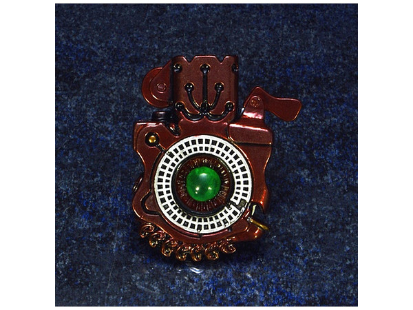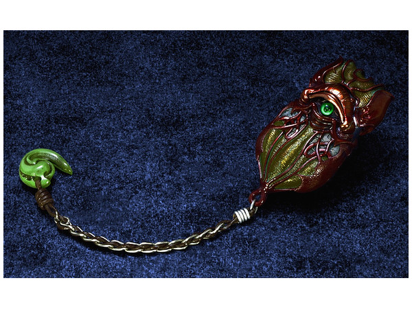 [ 蛇崩猛竜 ]が纏う鎧と同じカラーリングの本体は、ずっしりと重みがあるダイキャスト製で、瞳部分が劇中同様に開閉。根付部分は竹谷氏考案のオリジナルデザイン。魔導火内部を同梱のライターパーツに差し替える事によって、劇中での着火シーンを再現可能。