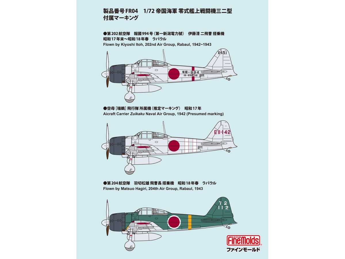 マーキングはガダルカナル/ニューギニアにて活躍し撃墜破30機を数えるエース『伊藤清』の乗機と、空母瑞鶴飛行隊所属機ほか、『ヒゲの羽切』と呼ばれたエース『羽切松雄』の機体のデカールを封入します。