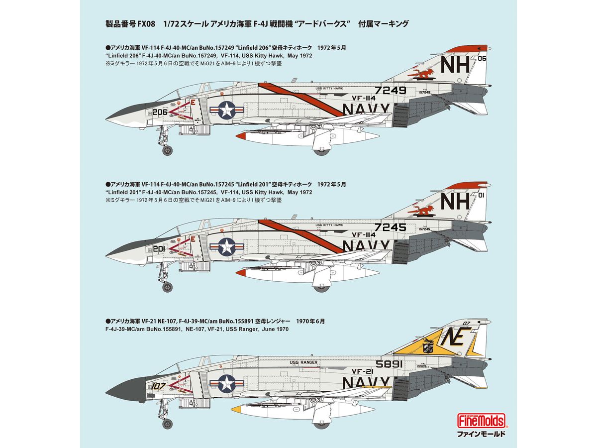 デカールは空母キティホーク搭載のVF-114(第114戦闘飛行隊) "アードバークス"所属機より2機のミグキラー、ならびに空母レンジャーに搭載され1968年から'79年間でF-4Jを使用したVF-21(第21戦闘飛行隊)”フリーランサーズ”より1機のマーキングを用意します。