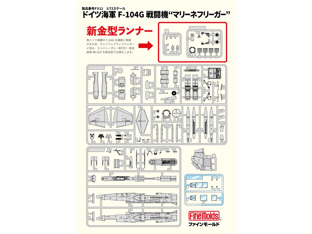 本キットではこの西ドイツ海軍が採用したF-104Gを精密に再現するべく、チャフフレアディスペンサーに加え、エンジンノズル・航行灯装備・Mk.GQ7射出座席を新金型で立体化。