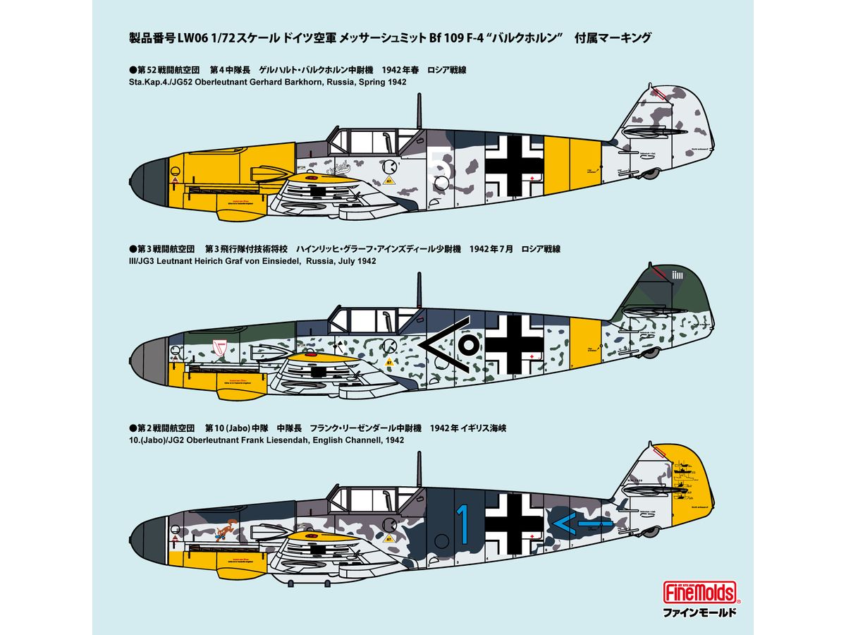 マーキングはJG3所属機と、出撃回数1104回・総撃墜数歴史上2位の301機というスーパーエース バルクホルンの搭乗機、さらに艦船攻撃のエキスパートであるフランク・リーゼンダール搭乗機も付属しています。