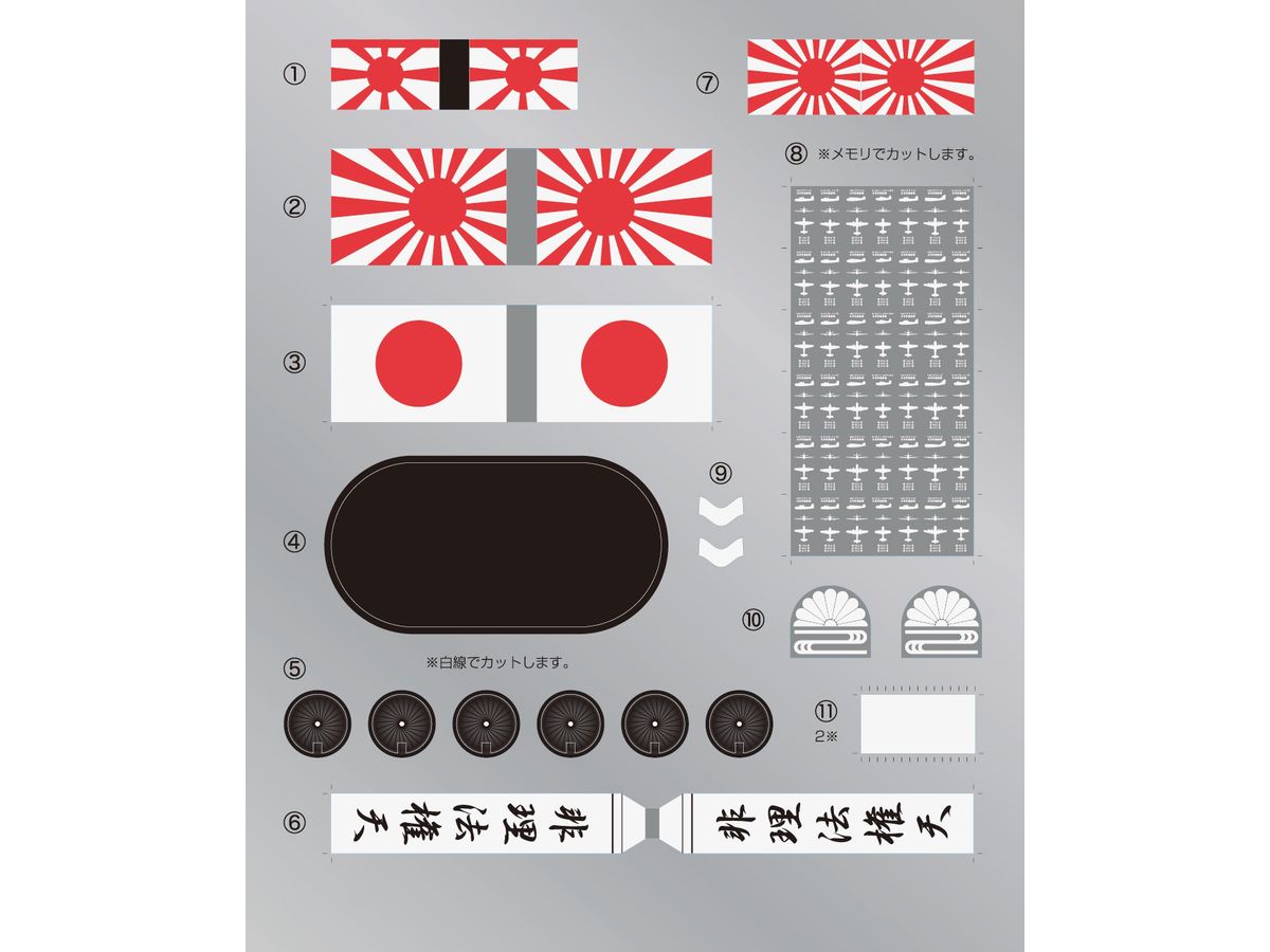 □シールにはマストに掲げる戦闘旗、天一号作戦時の司令官座上を示す中将旗シールを収録。