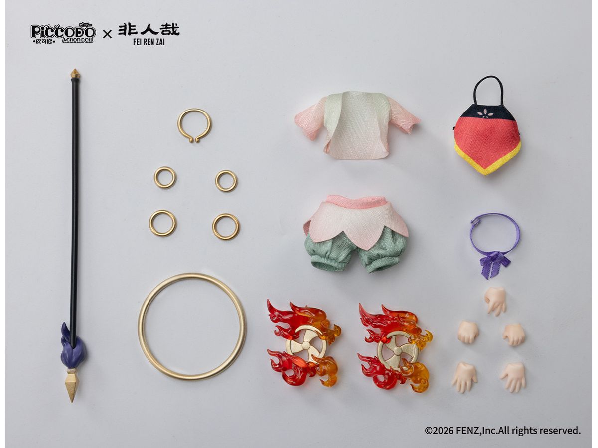 セットには「肚兜」や「混天綾」などの衣装パーツに加え、「火尖槍」「乾坤圏」「風火二輪」といったおなじみの装備も付属。
