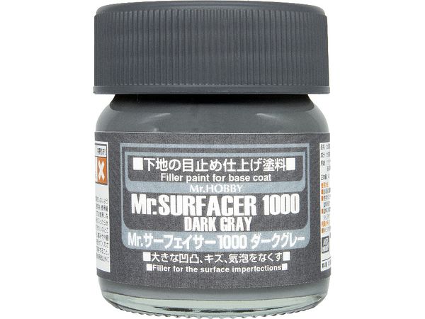 溶剤系のMr.サーフェイサーに、メカ部分などにそのまま使用できるなど、汎用性の高いダークグレータイプが登場です。