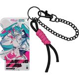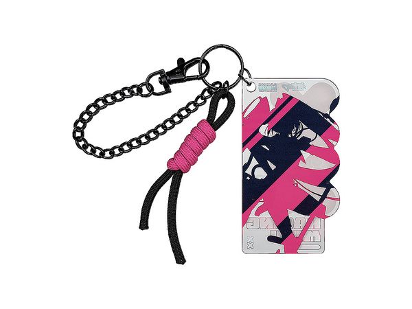 カード風キーホルダーに金属チェーンと黒×ピンクの組みひもを合わせました。