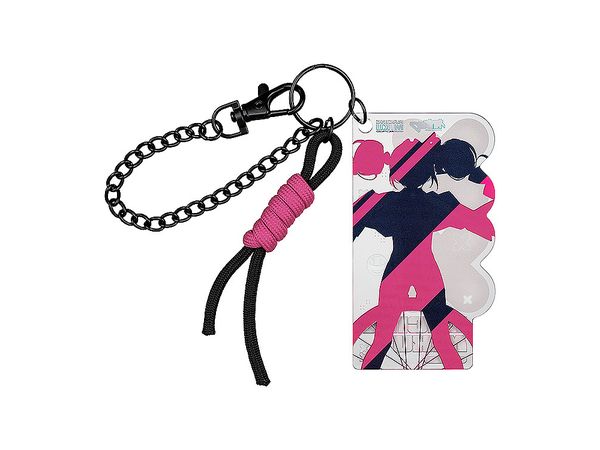 カード風キーホルダーに金属チェーンと黒×ピンクの組みひもを合わせました。