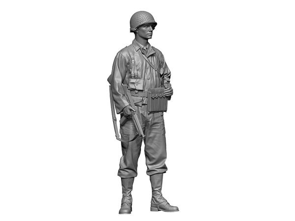 偽装ネット付きヘルメットを被り、M1942HBT作業服を着用、キャンバスレギンスとアングルブーツを履き、M1A1短機関銃を右手に持って直立する下士官(軍曹)の姿をモデル化しました。