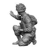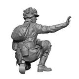空挺ヘルメットに擬装を施し、各部に多数のポケットがある空挺ジャケットとトラウザーを着用、左手でM1A1トンプソン短機関銃を支えながら左膝を付けて座り、右手で後方にサインを送る空挺兵をモデル化しました。