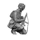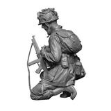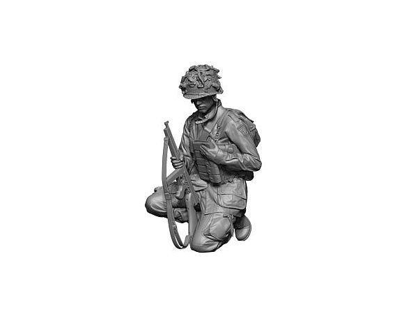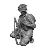 空挺ヘルメットに擬装を施し、各部に多数のポケットがある空挺ジャケットとトラウザーを着用、左膝を付けて座り、右手でM1A1トンプソン短機関銃を支えながら左手でマガジンポーチを探る空挺兵をモデル化しました。