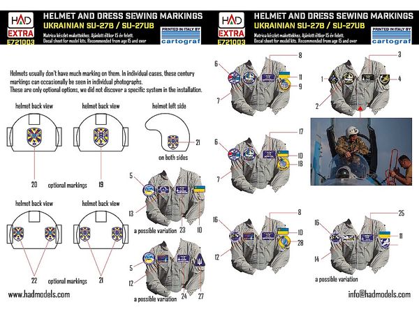 ウクライナ空軍SU-27クルー用ヘルメットデカール5種とフライトジャケット用ワッペン7種が付属。