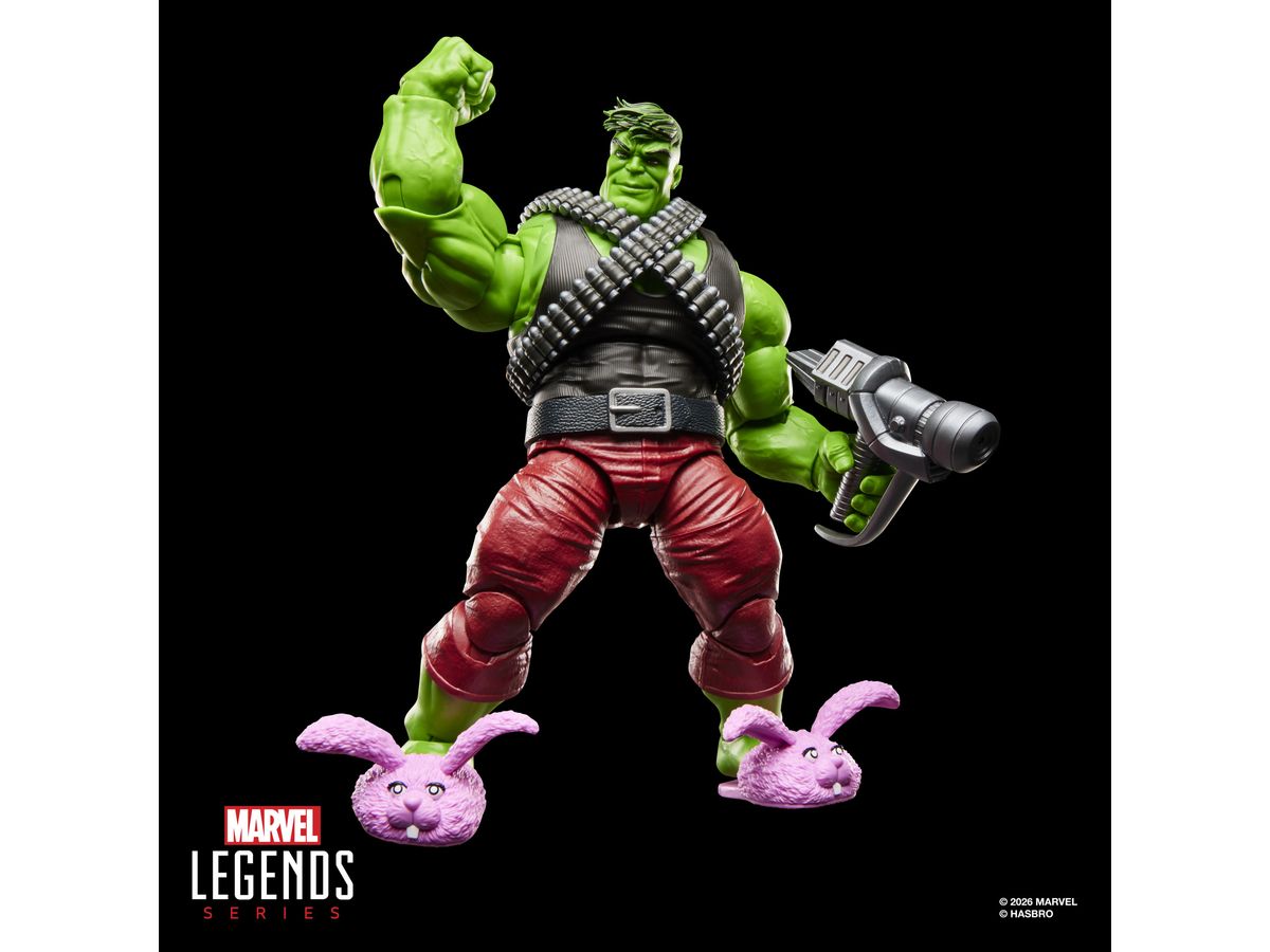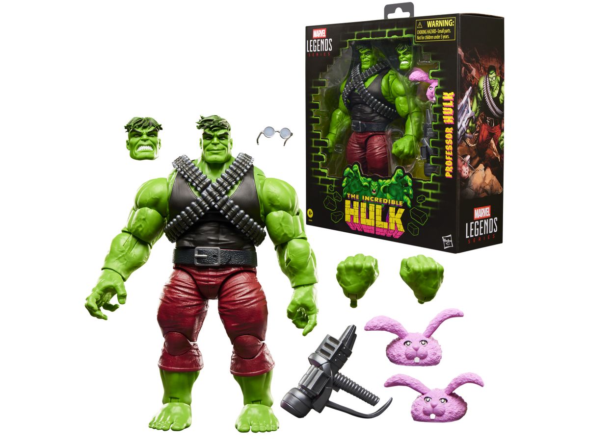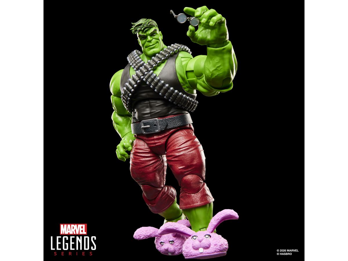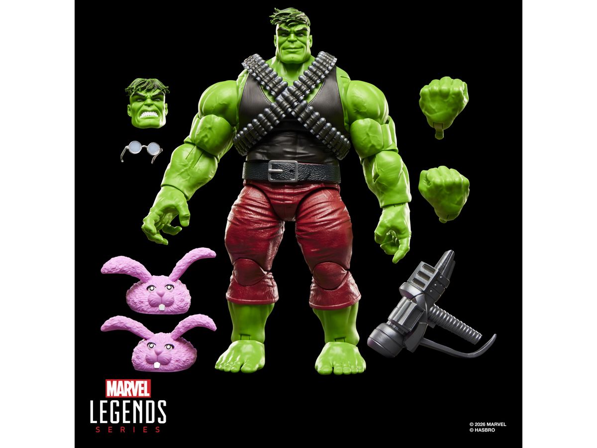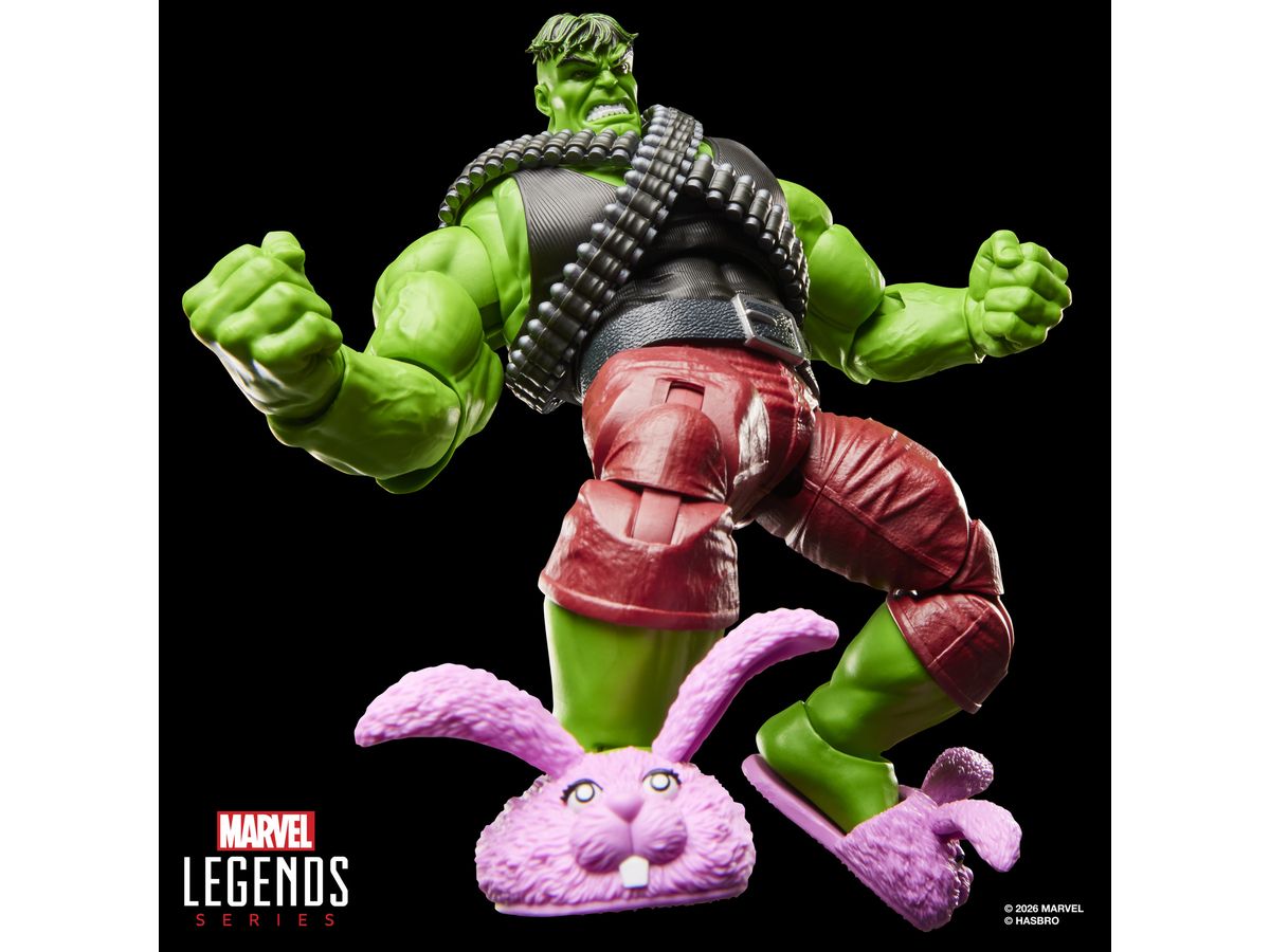 公式ライセンス商品の Hasbro マーベルレジェンドセットには、怒りの表情をした交換用の顔、交換用のハルクの手 2 個、ブラスター、グラス、ピンクのうさぎのスリッパを含む 7 個のアクセサリーが付属しています