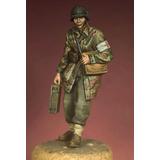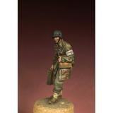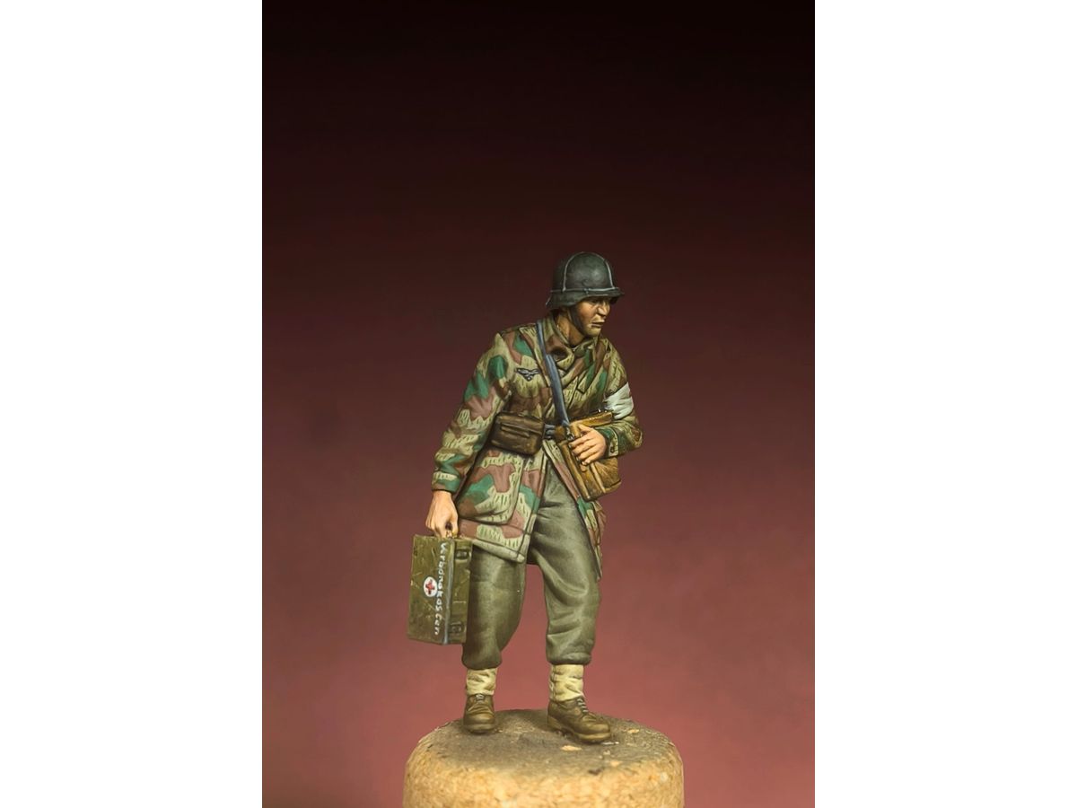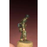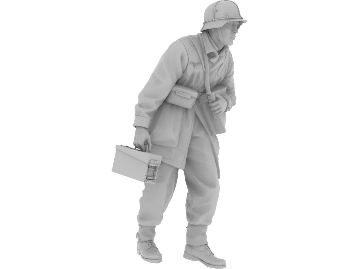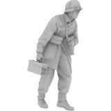 へルメットを被り迷彩降下スモックを着用、肩から救急バッグを下げ、右手に機関銃の弾薬箱を持ちながら歩く姿でモデル化しました。