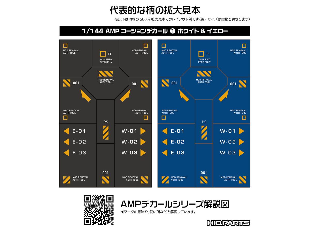 メカモデル向けの水転写式汎用コーションデカール「AMP」は、近年の細分化されたメカモデルのパーツ割に対応するため、デザインを刷新した新シリーズです。