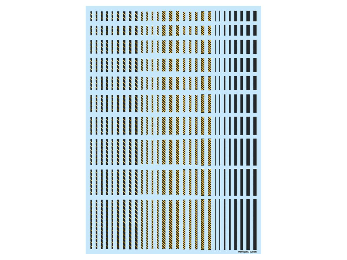 黒黄色は別名「トラテープ」としても知られていますが、トラテープ自体は黄色と黒の幅が同じものというJISの決まりがありますので、デカール内の柄には厳密にはトラテープ柄ではないものも入っています。