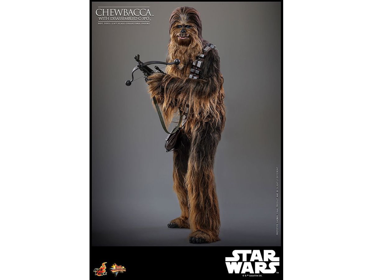 上半身、脚に付けられた左腕、誤って取り付けた左脚、右足の4つのパーツに分かれており、付属のネットを使用することで、チューバッカが分解されたC-3POを背負う劇中の姿を再現できるぞ。
