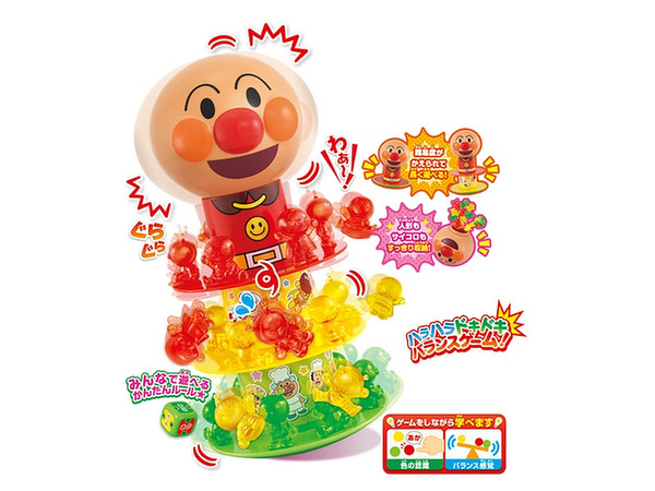 ゆらゆら揺れるアンパンマンのぐらりんタワーに、ふったサイコロの目と同じ色の人形を同じ色のタワーに落ちないように置いていくバランスゲームです。