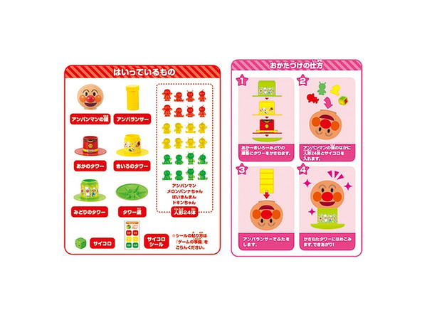 アンパンマンの頭、アンバランサー、あかのタワー、きいろのタワー、みどりのタワー、タワー底、サイコロ、サイコロシール、人形24体(アンパンマン、メロンパンナちゃん、ばいきんまん、ドキンちゃん)
