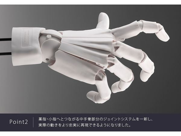従来品は手の甲の“フォルムを綺麗に見せる”をポイントにした可動構造でしたが、このMEN'Sモデルでは薬指・小指へとつながる中手骨部分のジョイントシステムを一新し、実際の動きをより忠実に再現できるようになりました。