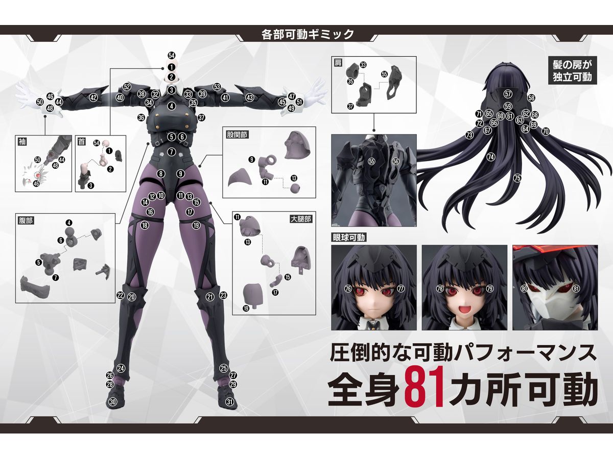 全身に50カ所以上の可動ギミックを備えており、ネイキッドフェイスの眼球可動を含めるとその数はなんと81カ所となります。