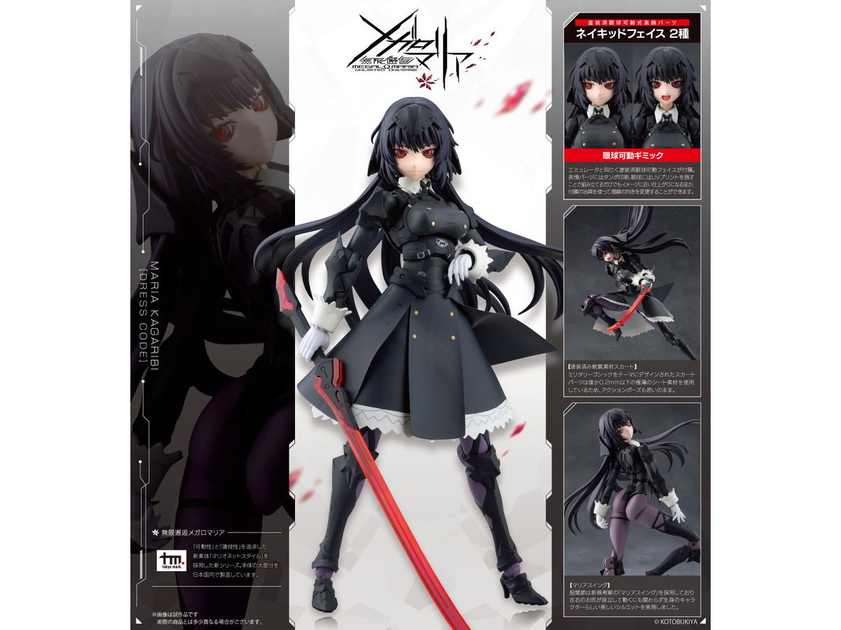 メガロマリアシリーズのフラッグシップとするべく新規導入の軟質製スカートパーツや塗装済眼球可動フェイスに加えて、新規考案の股関節可動ギミック「マリアスイング」を備えた意欲作です。