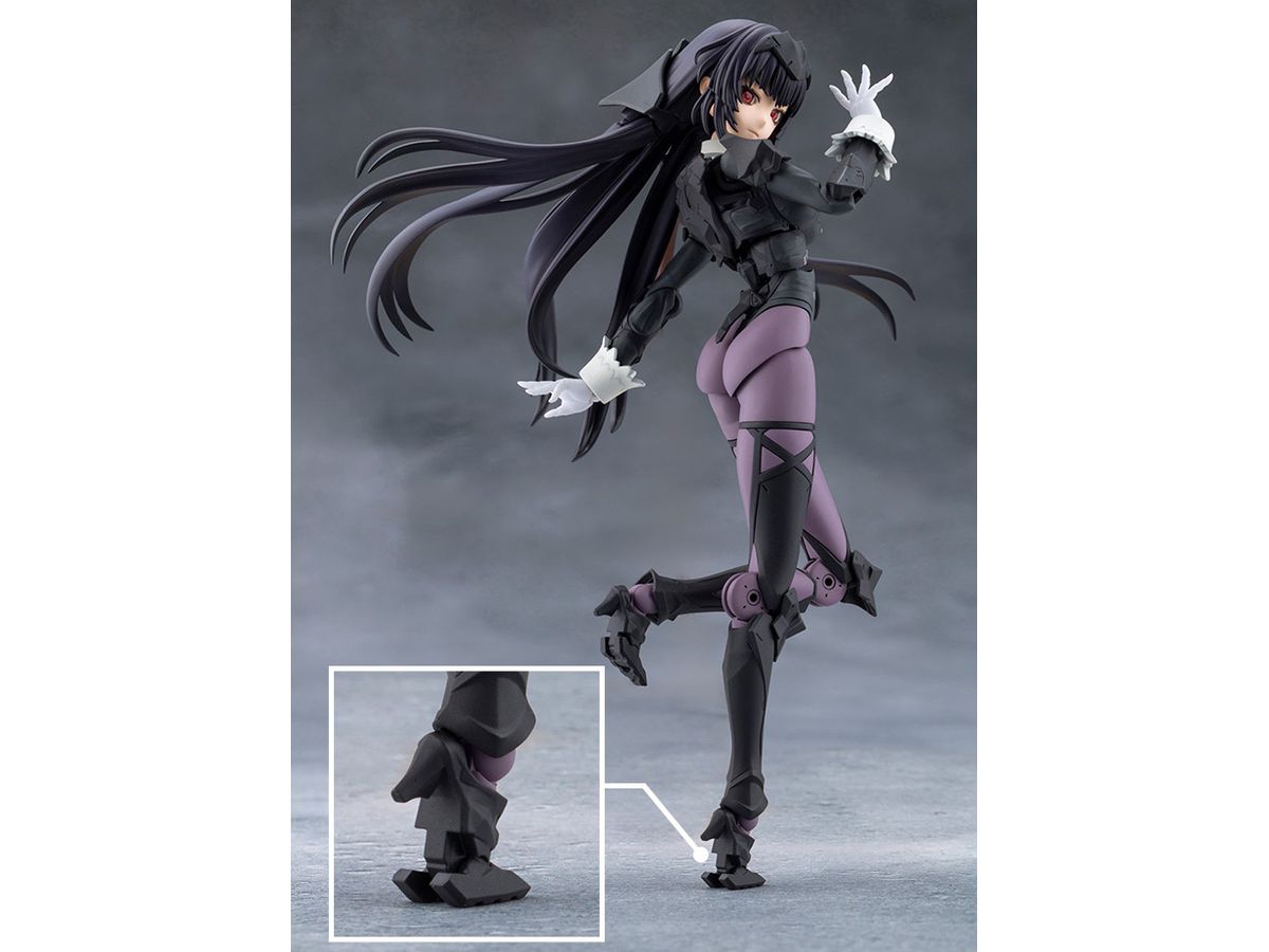 ミリタリーゴシックをテーマにデザインされたスカートパーツは僅か0.2mm以下の極薄のシート素材を使用しているため、アクションポーズ時に可動を阻害しにくいものとなっています。