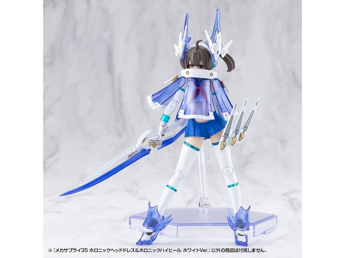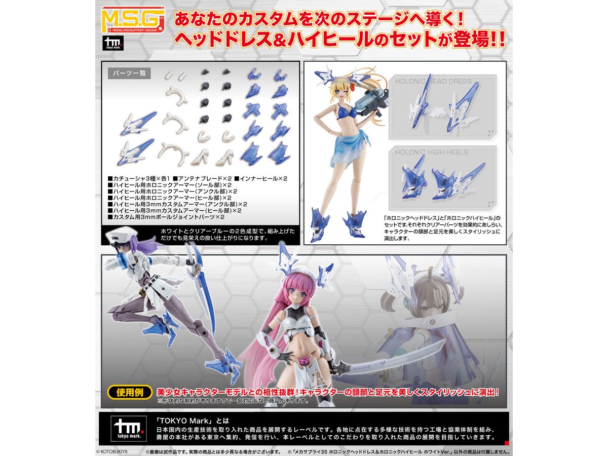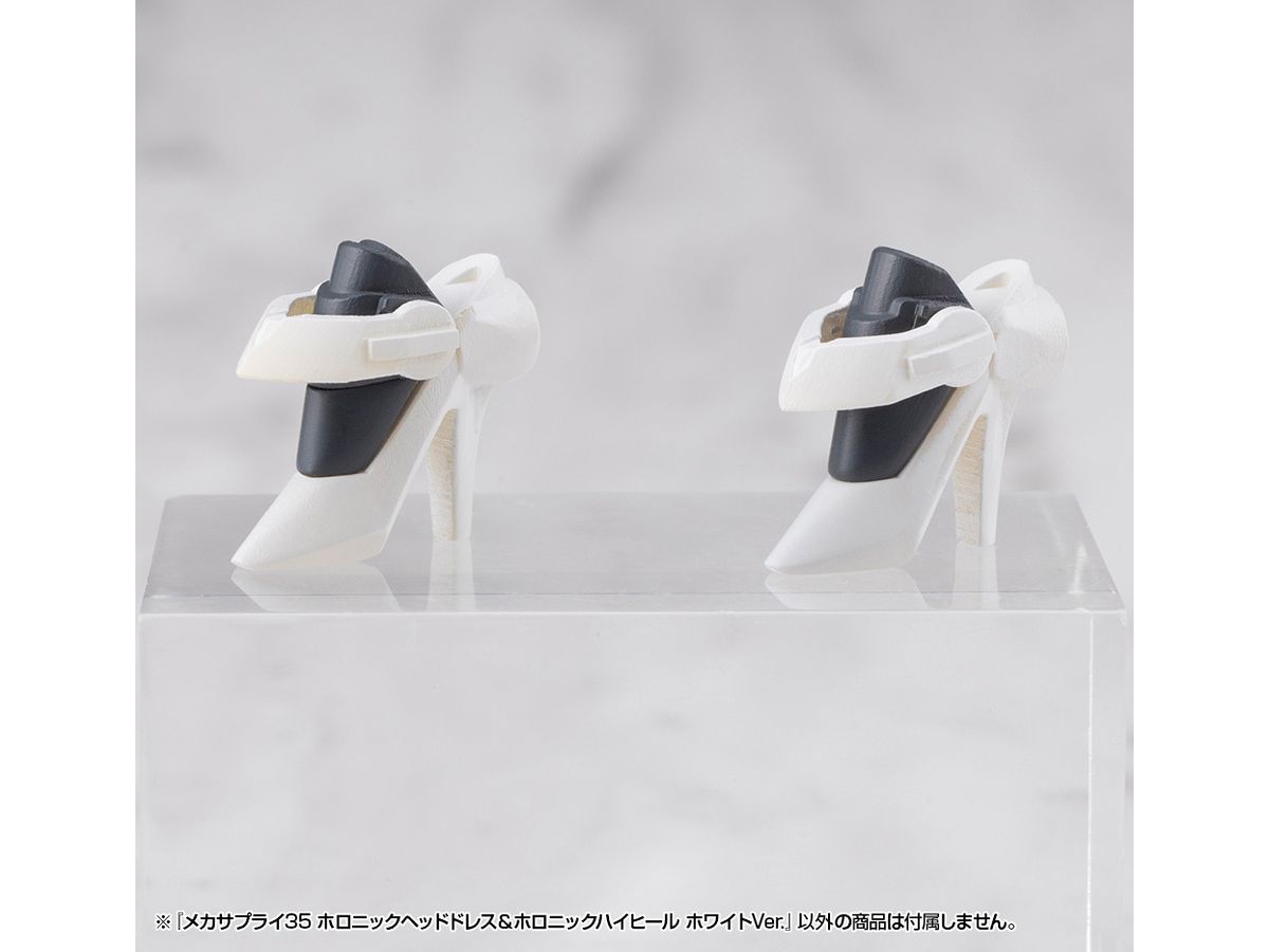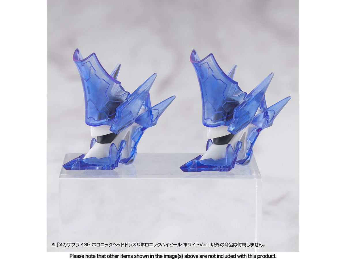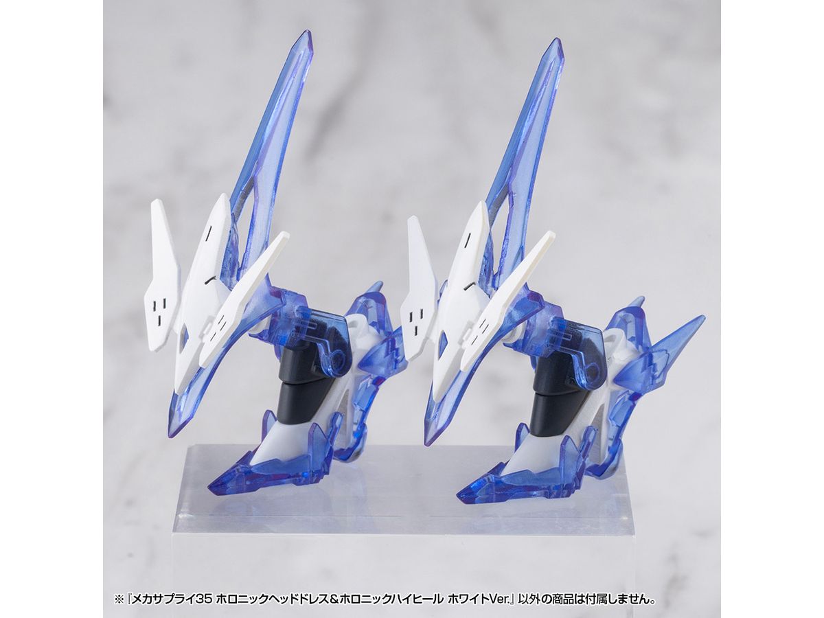 ■美少女キャラクターモデル向けの改造パーツ、「ホロニックヘッドドレス」と「ホロニックハイヒール」のセットです。それぞれクリアーパーツを効果的にあしらい、キャラクターの頭部と足元を美しくスタイリッシュに演出します。
