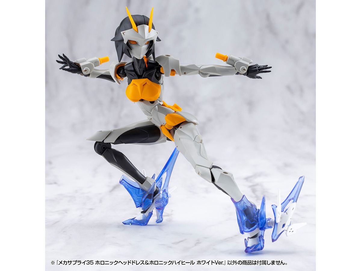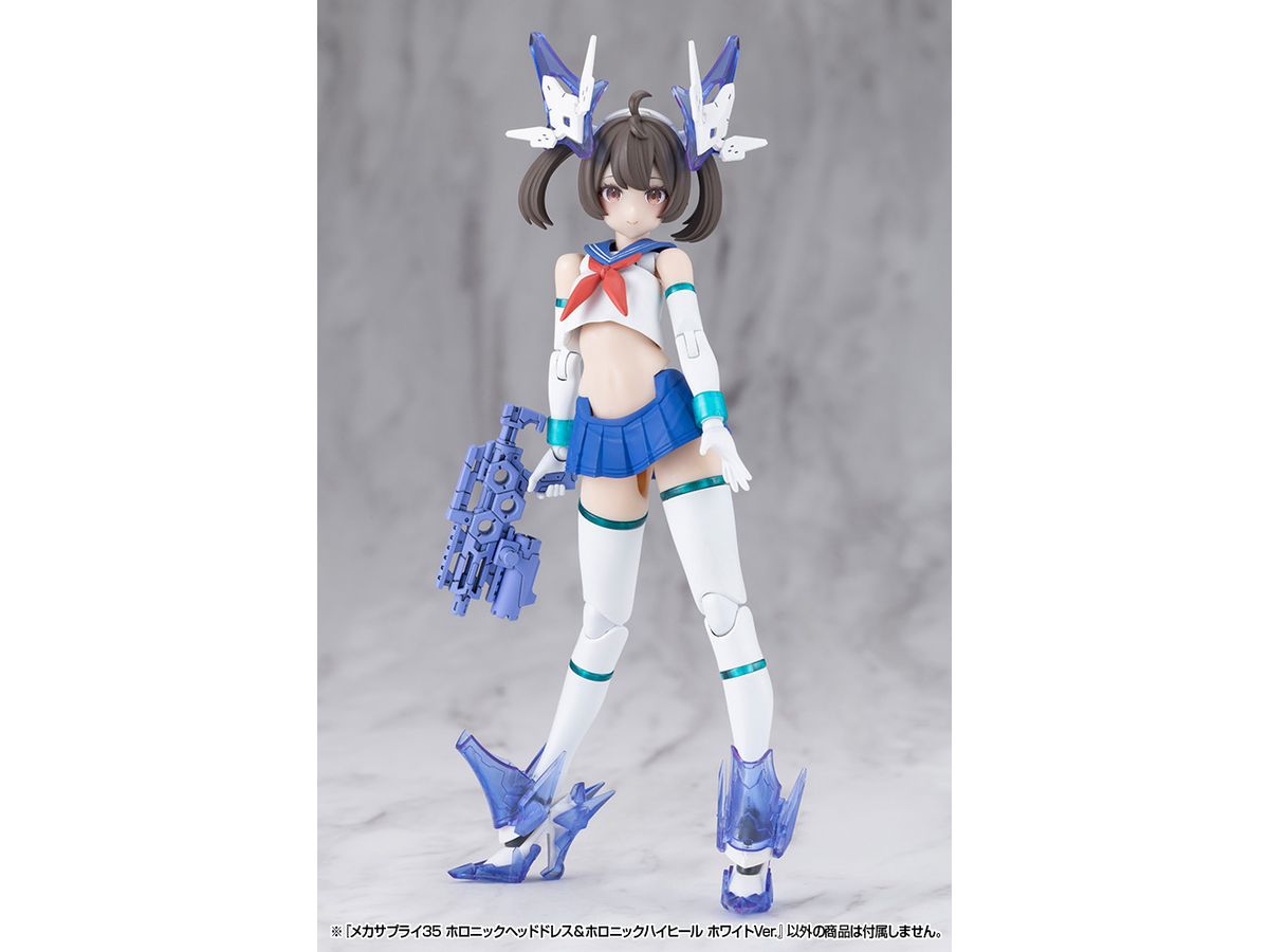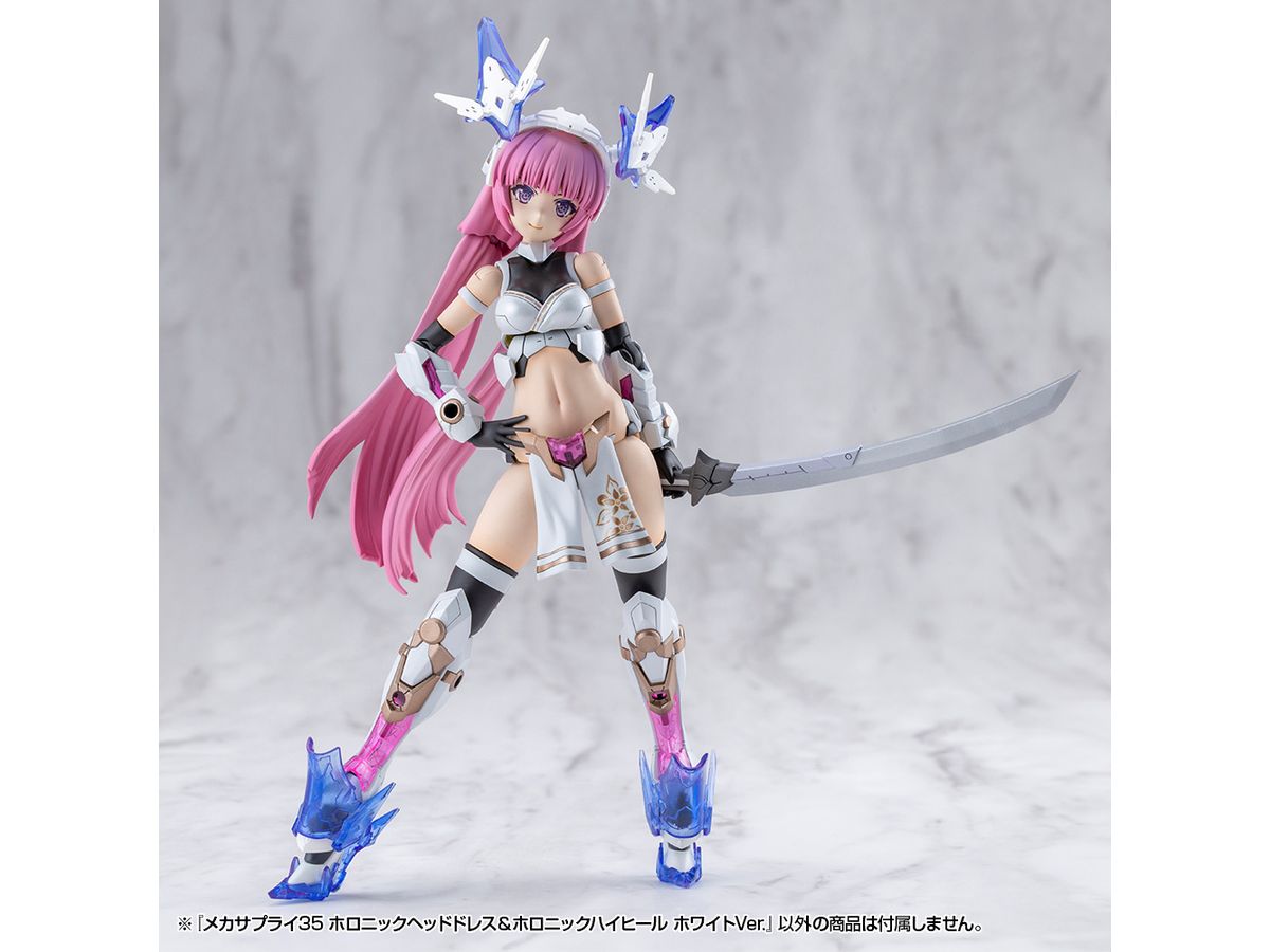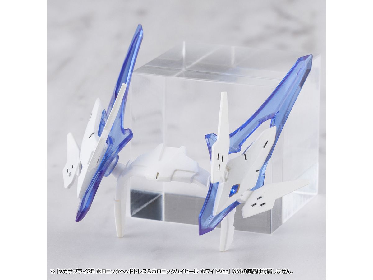 ■美少女キャラクターモデル向けの改造パーツ、「ホロニックヘッドドレス」と「ホロニックハイヒール」のセットです。それぞれクリアーパーツを効果的にあしらい、キャラクターの頭部と足元を美しくスタイリッシュに演出します。