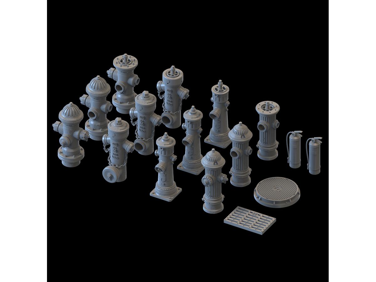 4種消火栓に消火器とグレーチング、マンホールの蓋が付属したセットです