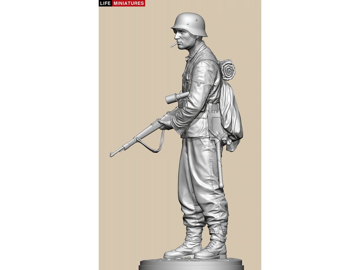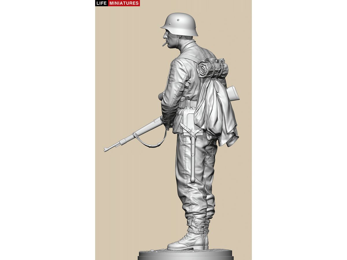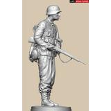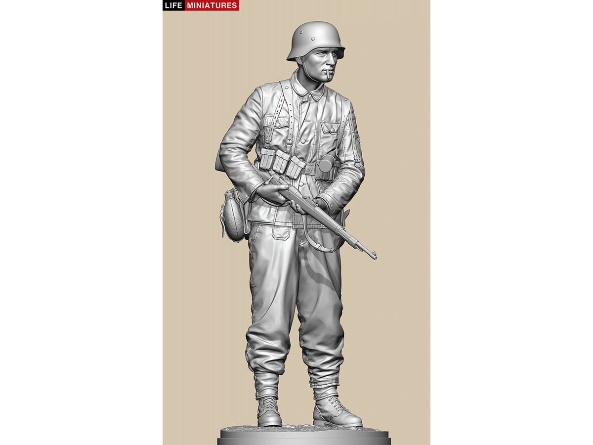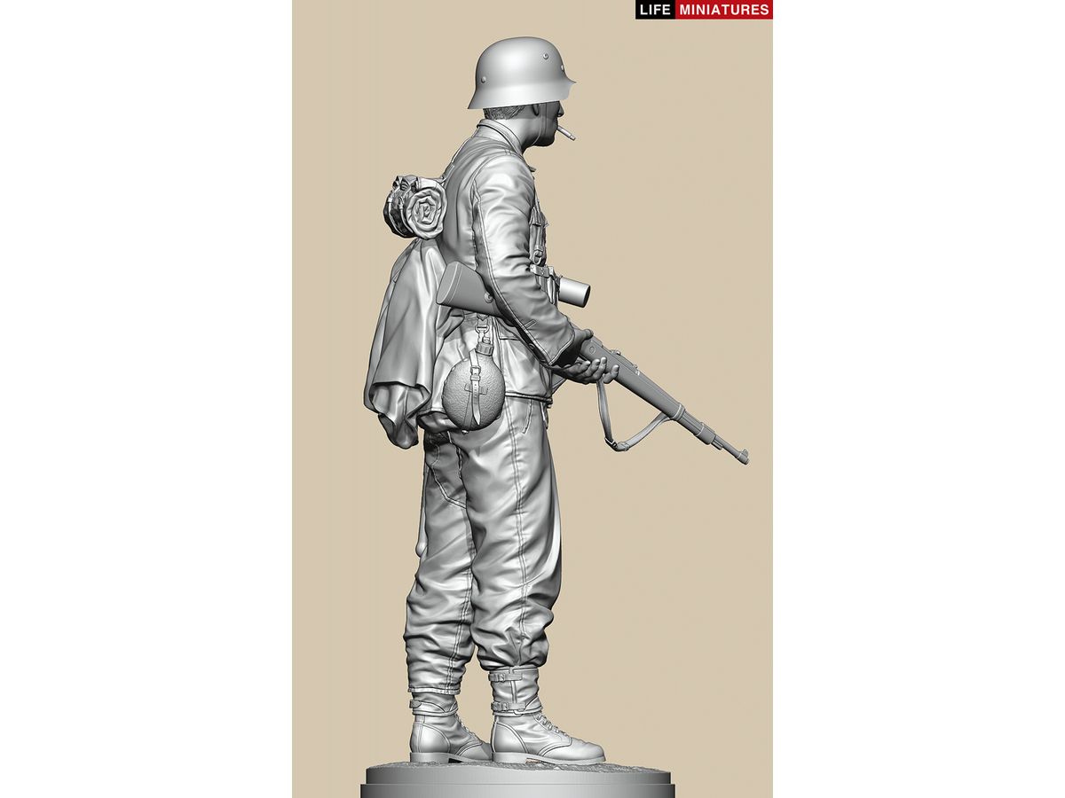 全高約180mm、1/10のフルサイズで3Dモデル化し、両手でKar98k小銃を持ち、左脇に柄付き手榴弾をはさみ、タバコをくわえて前方を伺う姿を再現しています。
