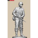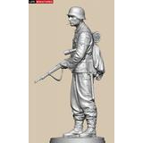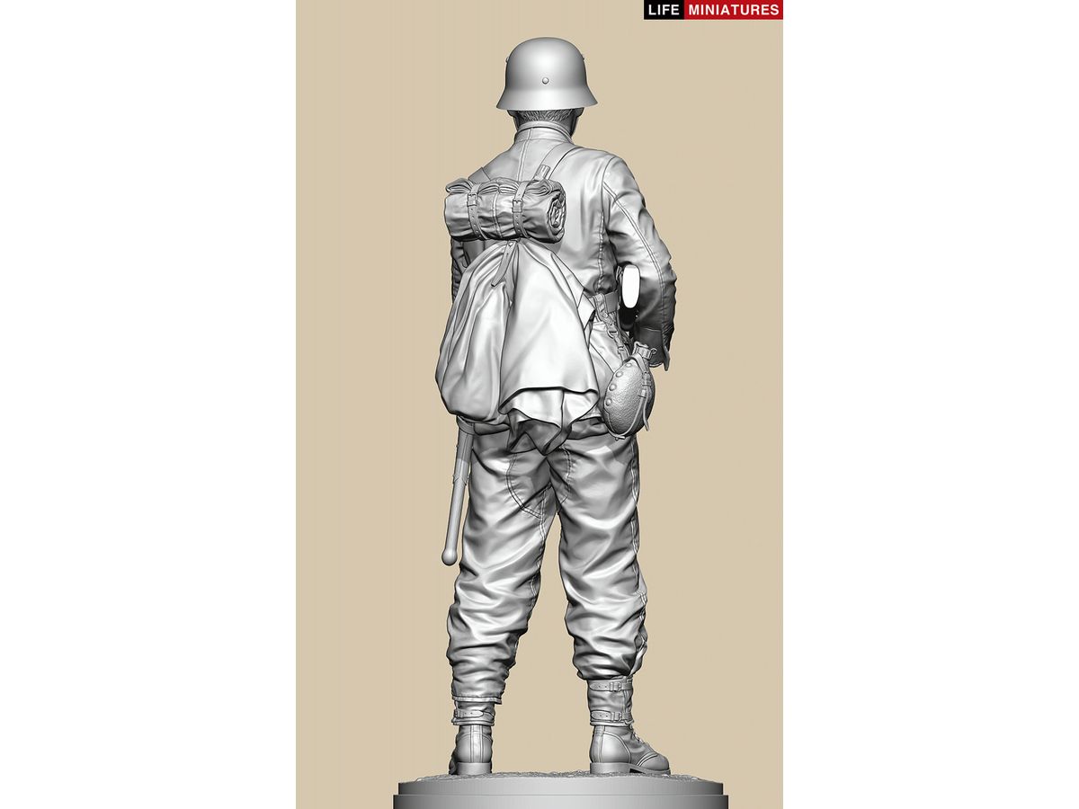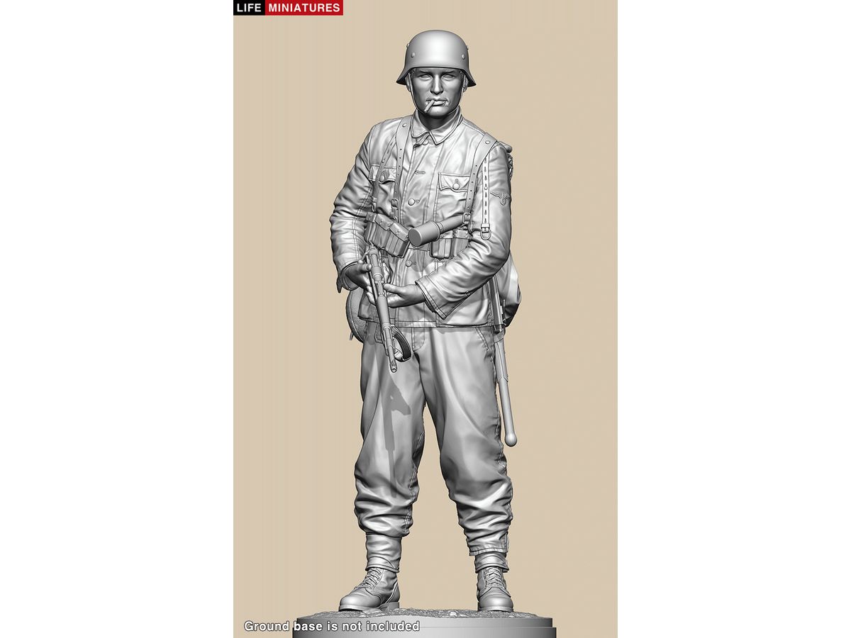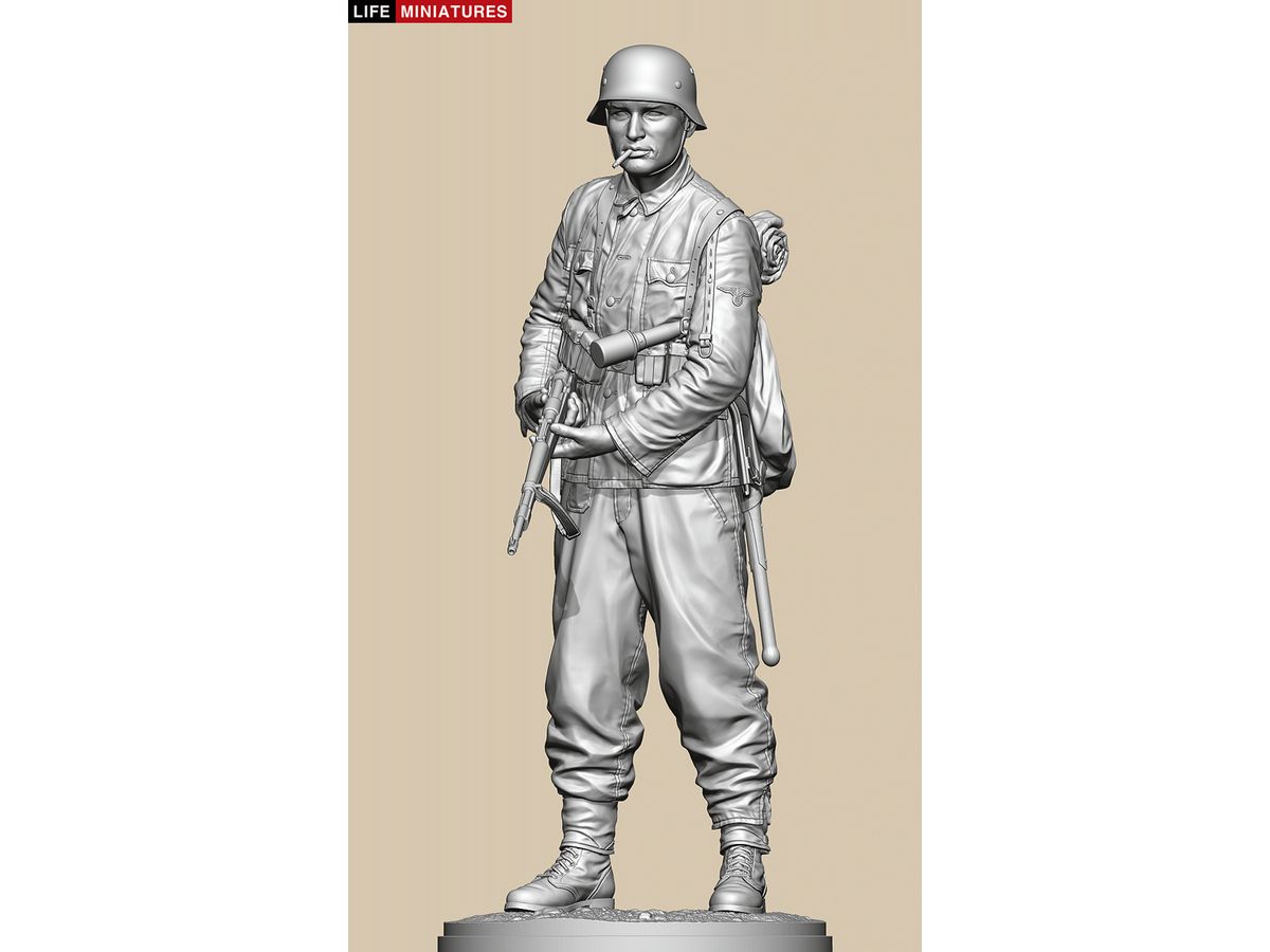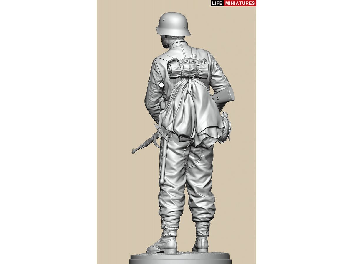 全高約180mm、1/10のフルサイズで3Dモデル化し、両手でKar98k小銃を持ち、左脇に柄付き手榴弾をはさみ、タバコをくわえて前方を伺う姿を再現しています。