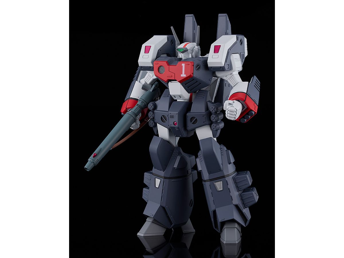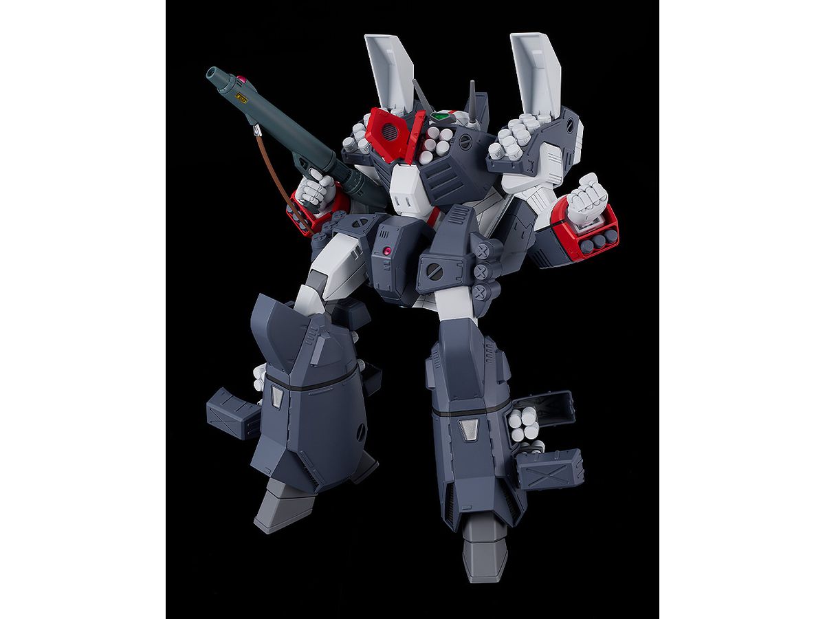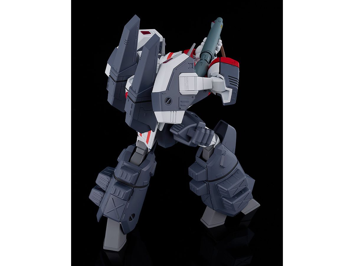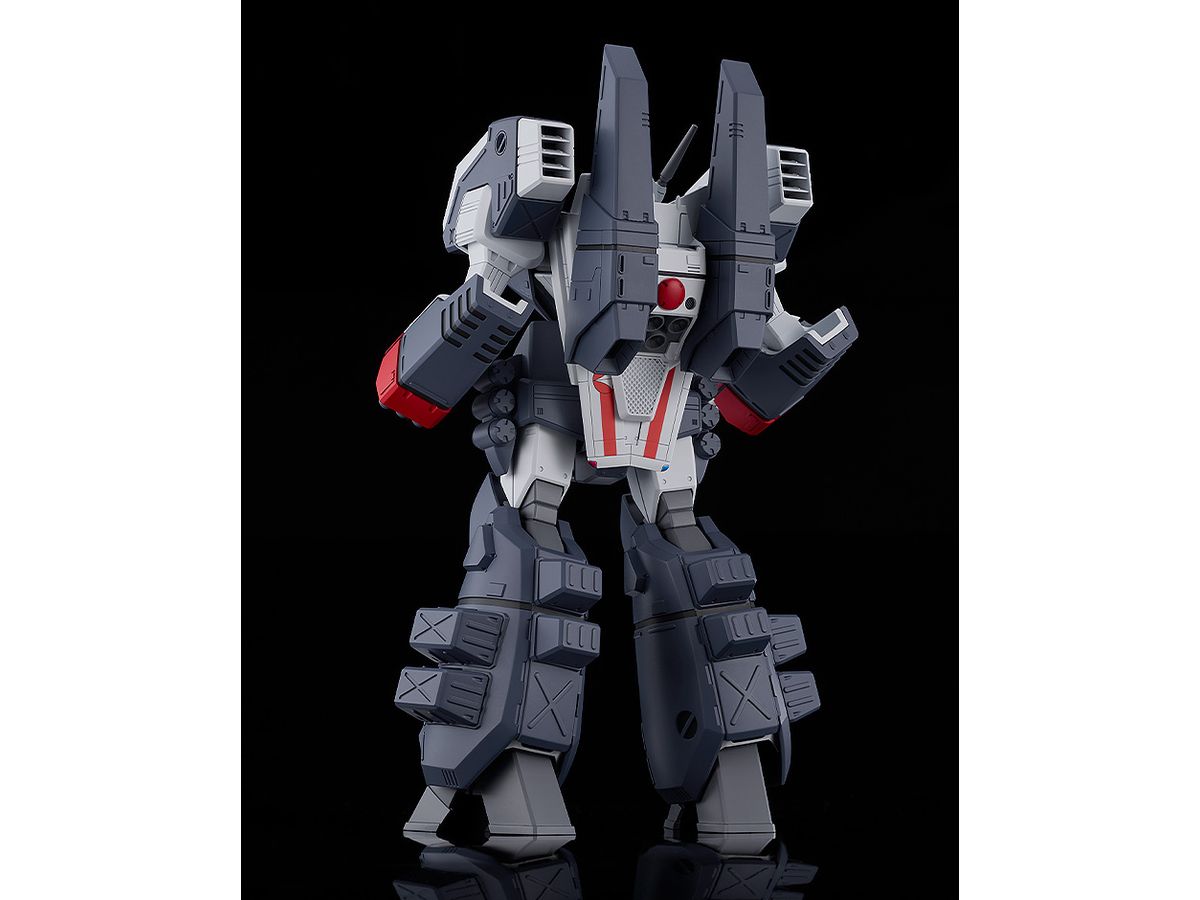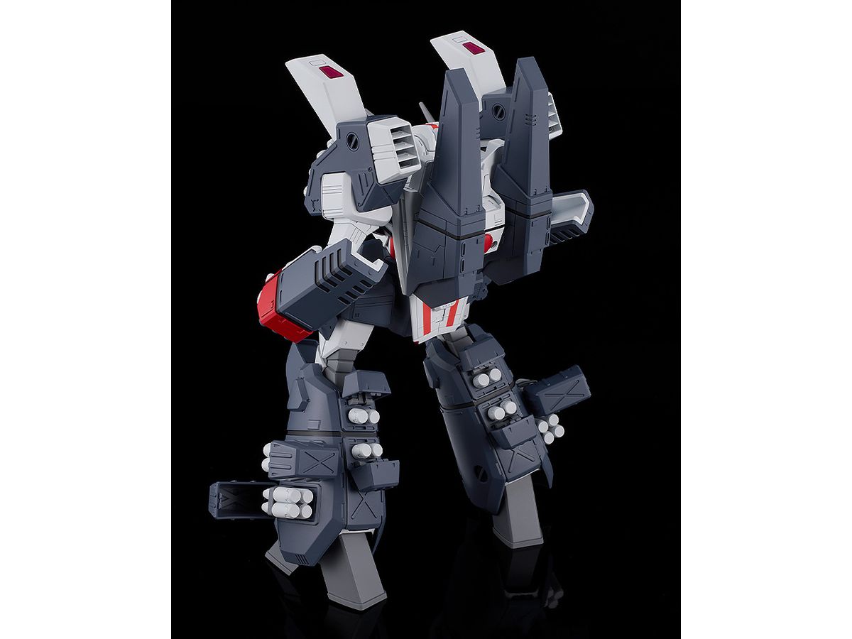 バトロイドバルキリーにウエポンコンテナや増槽など装着した状態を、変形やアーマード装備脱着機構をあえて廃することで設定画やアニメ登場時に見られる力強くまとまり感がある姿で立体化しました。