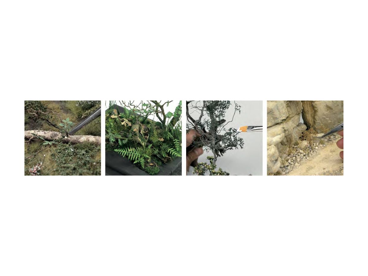 本書前半では樹木や植物を製作する手助けとなる、多種多様な素材について考察し、後半では様々な種類の樹木や草花、地形に応じた表現法など、実際の製作方法を紹介します。