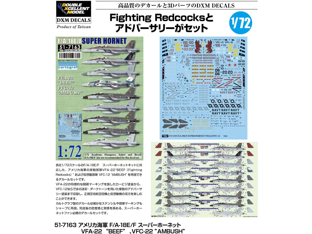 各社1/72スケールのF/A-18E/F スーパーホーネットキットに対応した、アメリカ海軍の実戦部隊VFA-22“BEEF(Fighting Redcocks)” および仮想敵部隊 VFC-12 “AMBUSH” を再現できるデカールセットです。