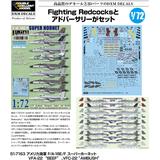 VFA-22の特徴的な闘鶏マーキングを施したロービジ塗装から、VFC-12ならではの迷彩・ダークトーンを用いた複数のアドバーサリー塗装まで収録し、正規空母航空団機と仮想敵機の双方を楽しむことができます。