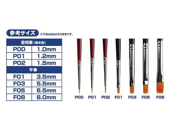 面相筆/参考サイズ ※根本側 P00 1.0mm P01 1.2mm P02 1.5mm