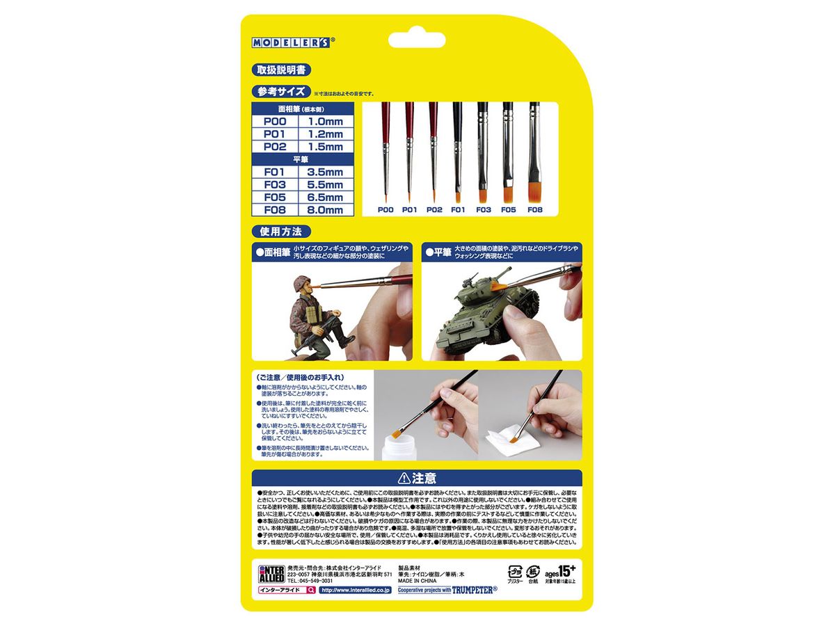 フィギュア塗装用の面相筆、比較的に大面積の塗装、デカール類を馴染ませる等の様々なテクニックに応用できる平筆がセットされています。