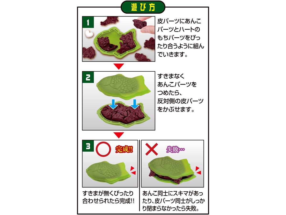 皮パーツの中に、あんこパーツを正しく組み合わせていれるとたい焼きが完成するバズルです。