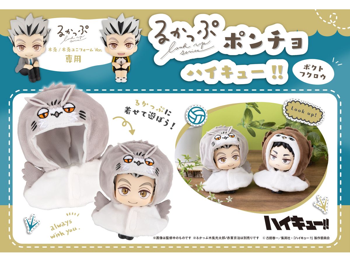 別売のるかっぷ木兎光太郎/木兎光太郎ユニフォームVer.にきせて遊べる「ボクトフクロウ」をイメージしたポンチョです。