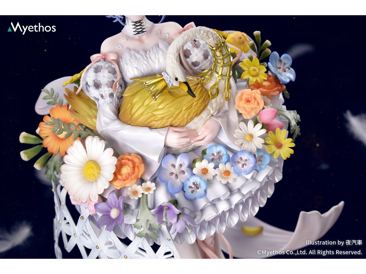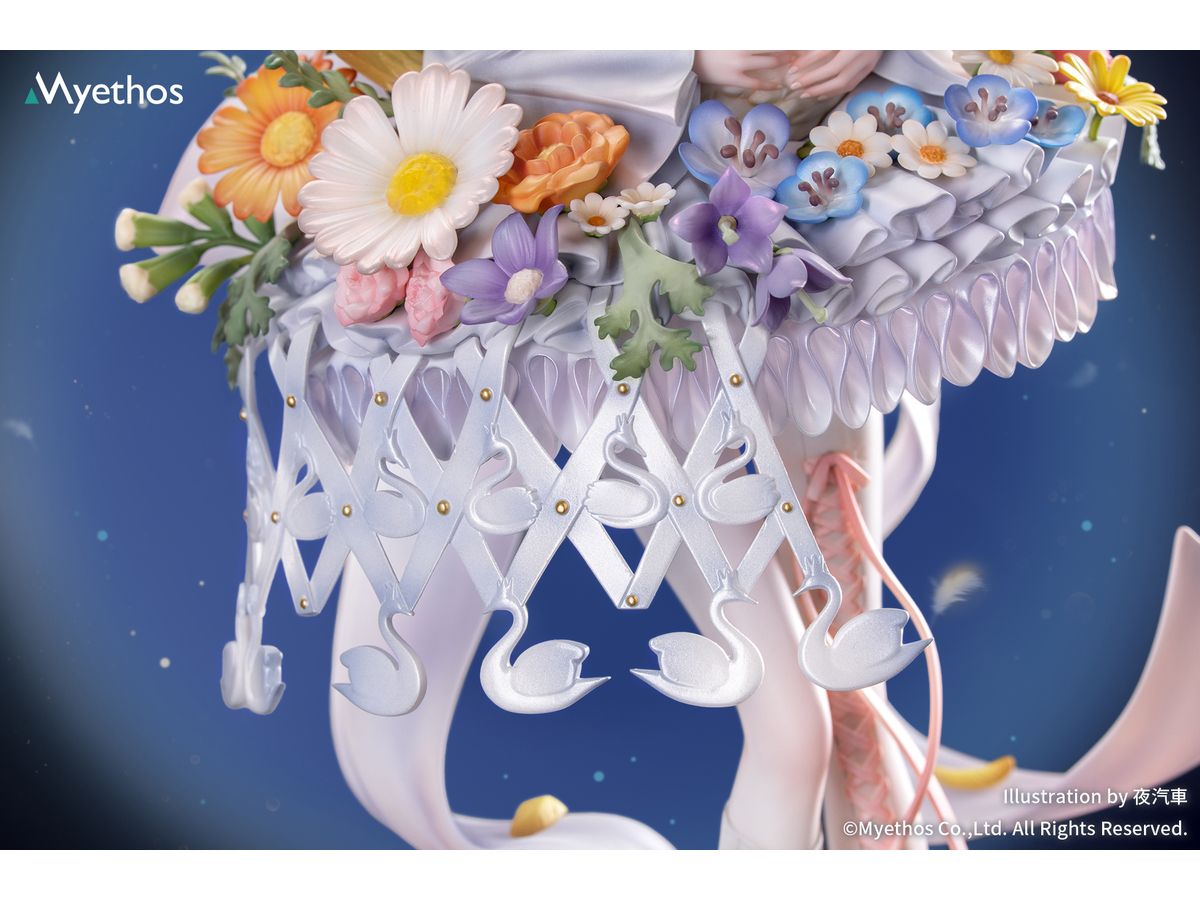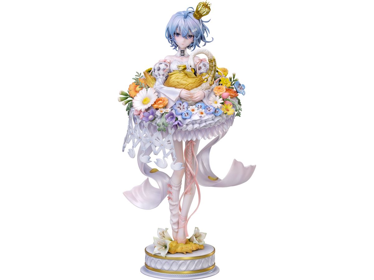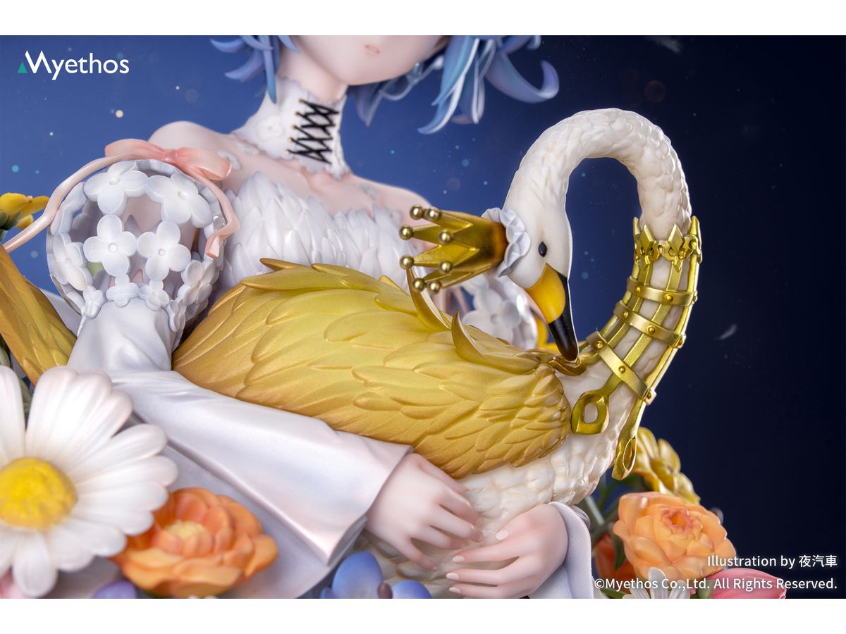 メタリック塗装が施された華やかな冠はきらめきを放ち、手のひらにそっと抱えた金色の白鳥は、スカート脇の透かし造形と白鳥モチーフのチャームと美しく呼応。
