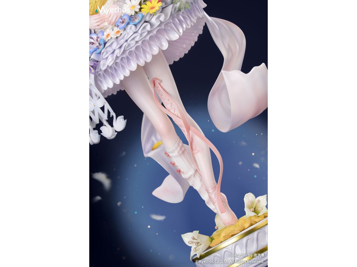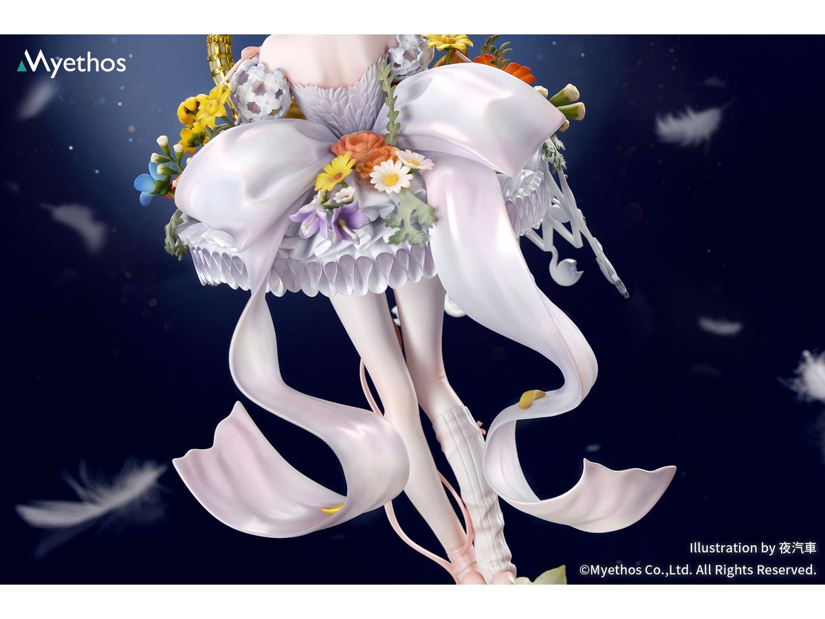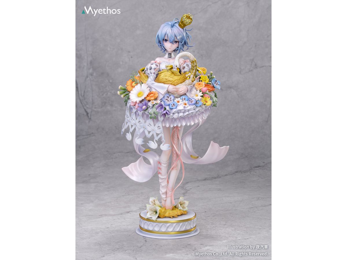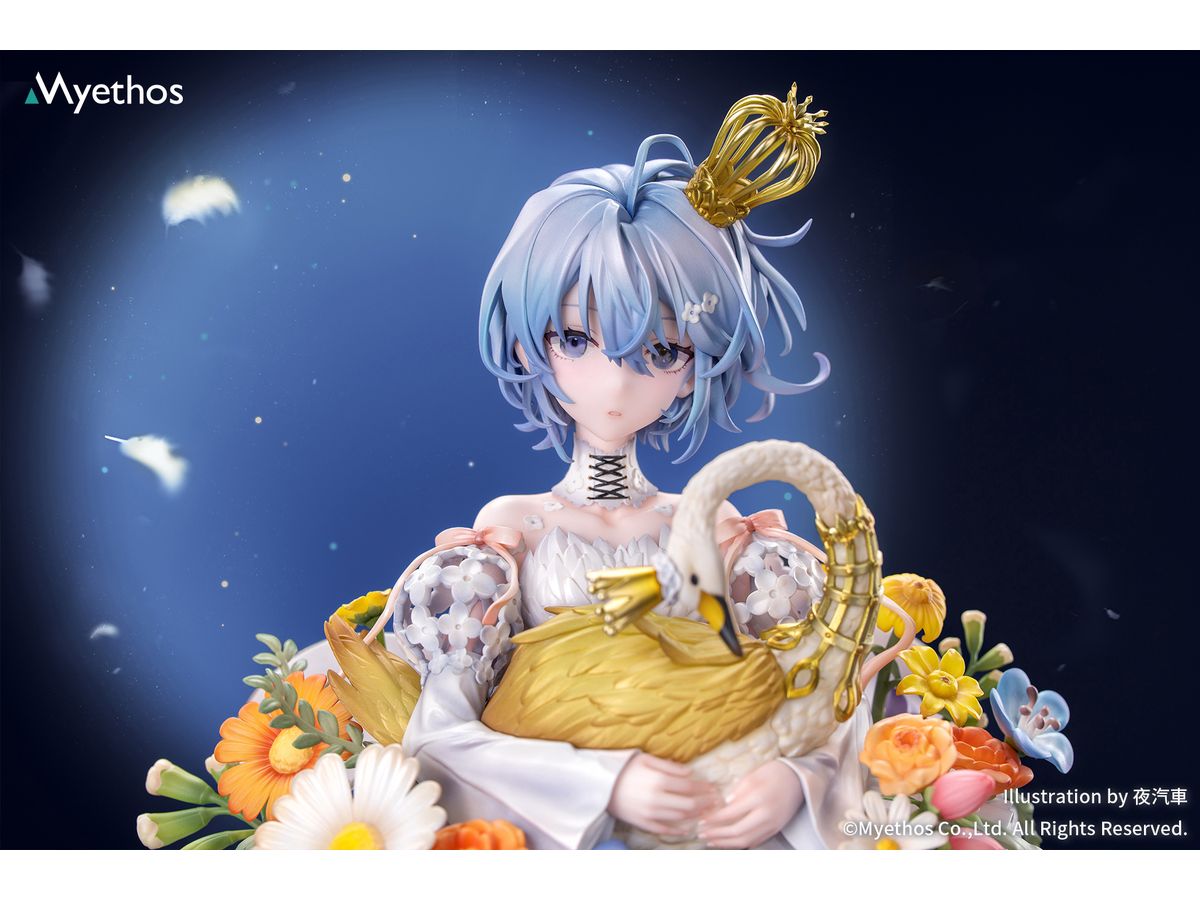 メタリック塗装が施された華やかな冠はきらめきを放ち、手のひらにそっと抱えた金色の白鳥は、スカート脇の透かし造形と白鳥モチーフのチャームと美しく呼応。