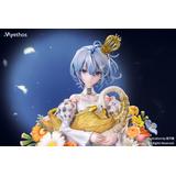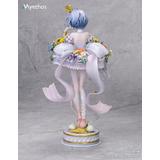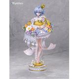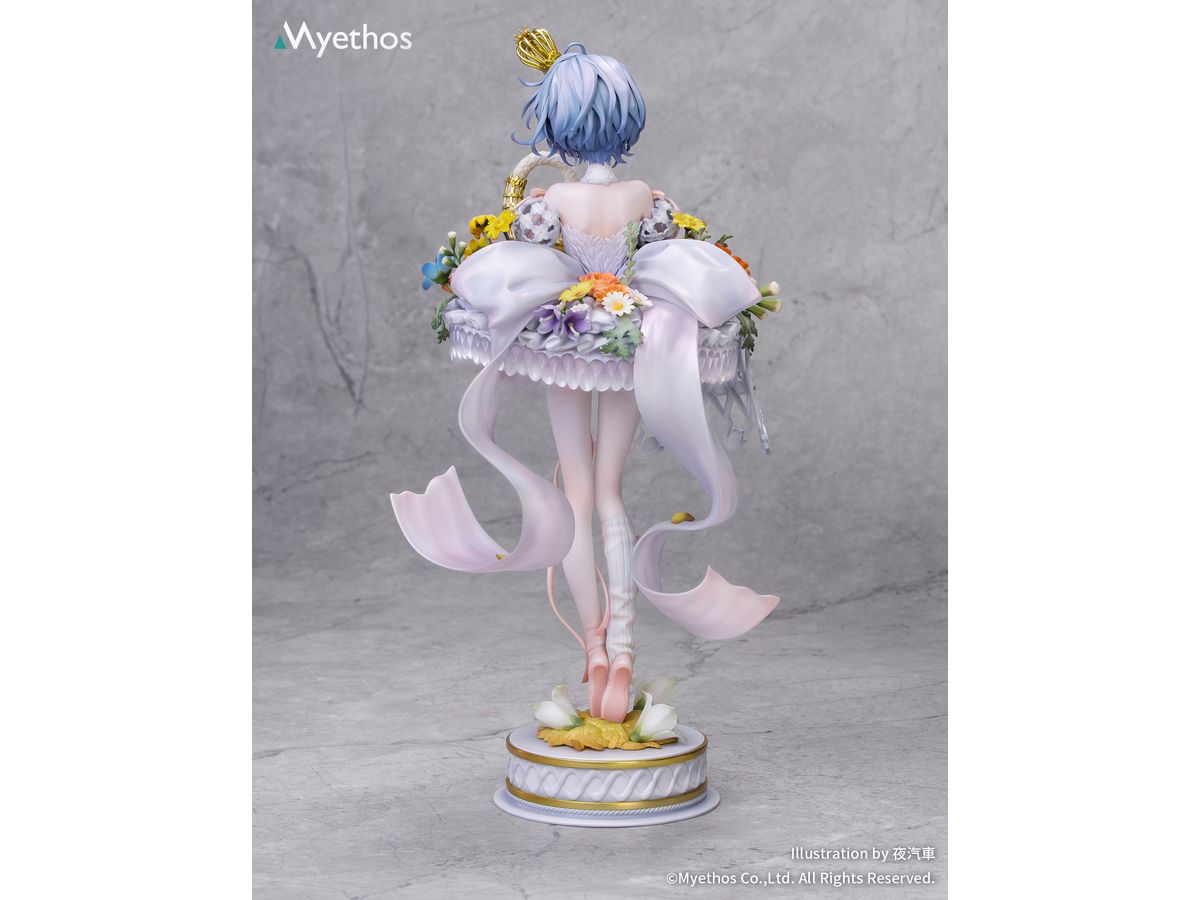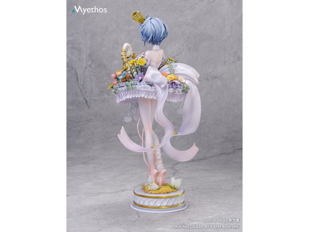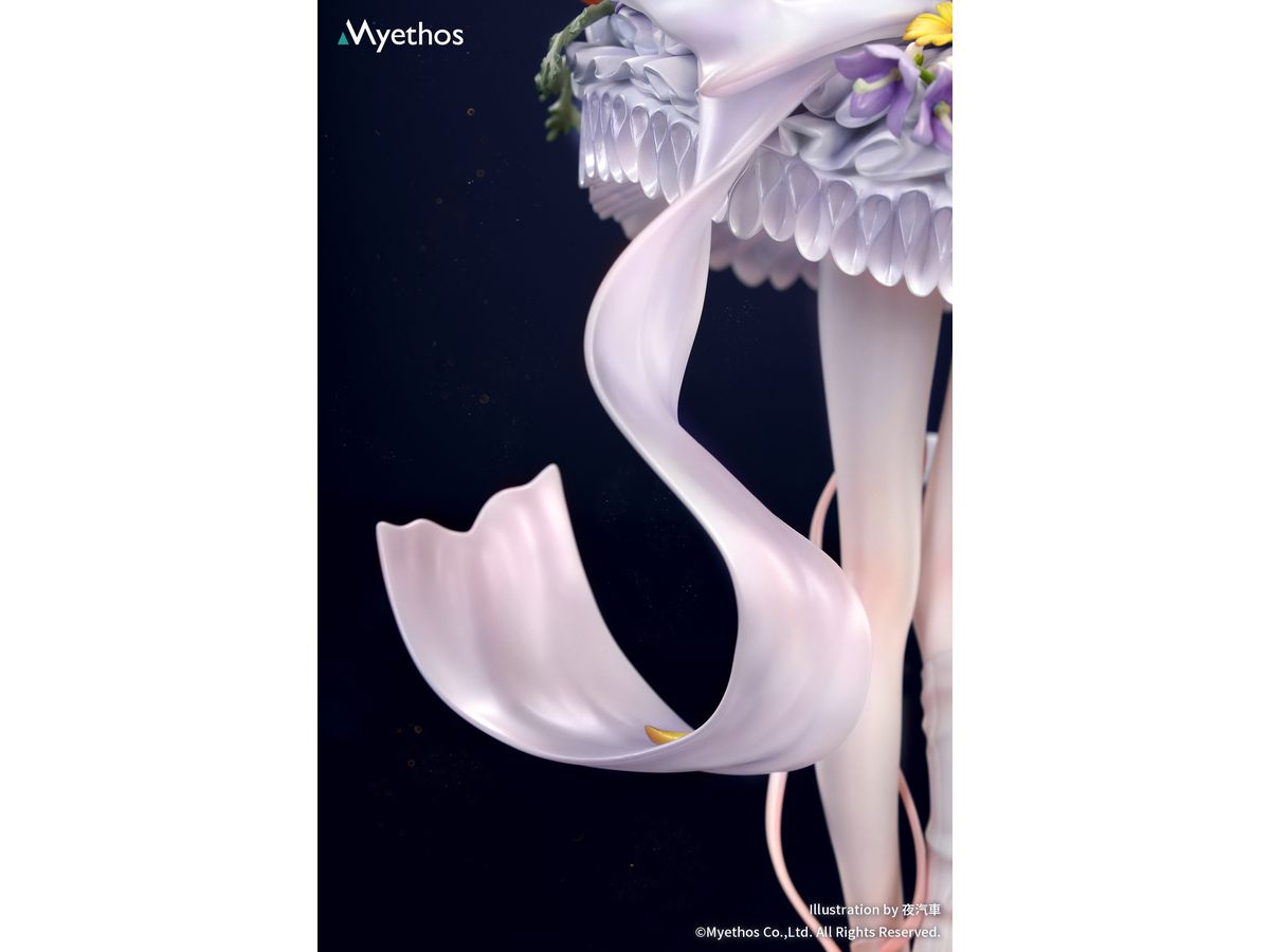 風に揺れるブルーの髪にはやわらかなパールの艶が宿り、背中から垂れる半透明の純白リボンは、白鳥の首元を思わせる優雅な曲線を描きます。