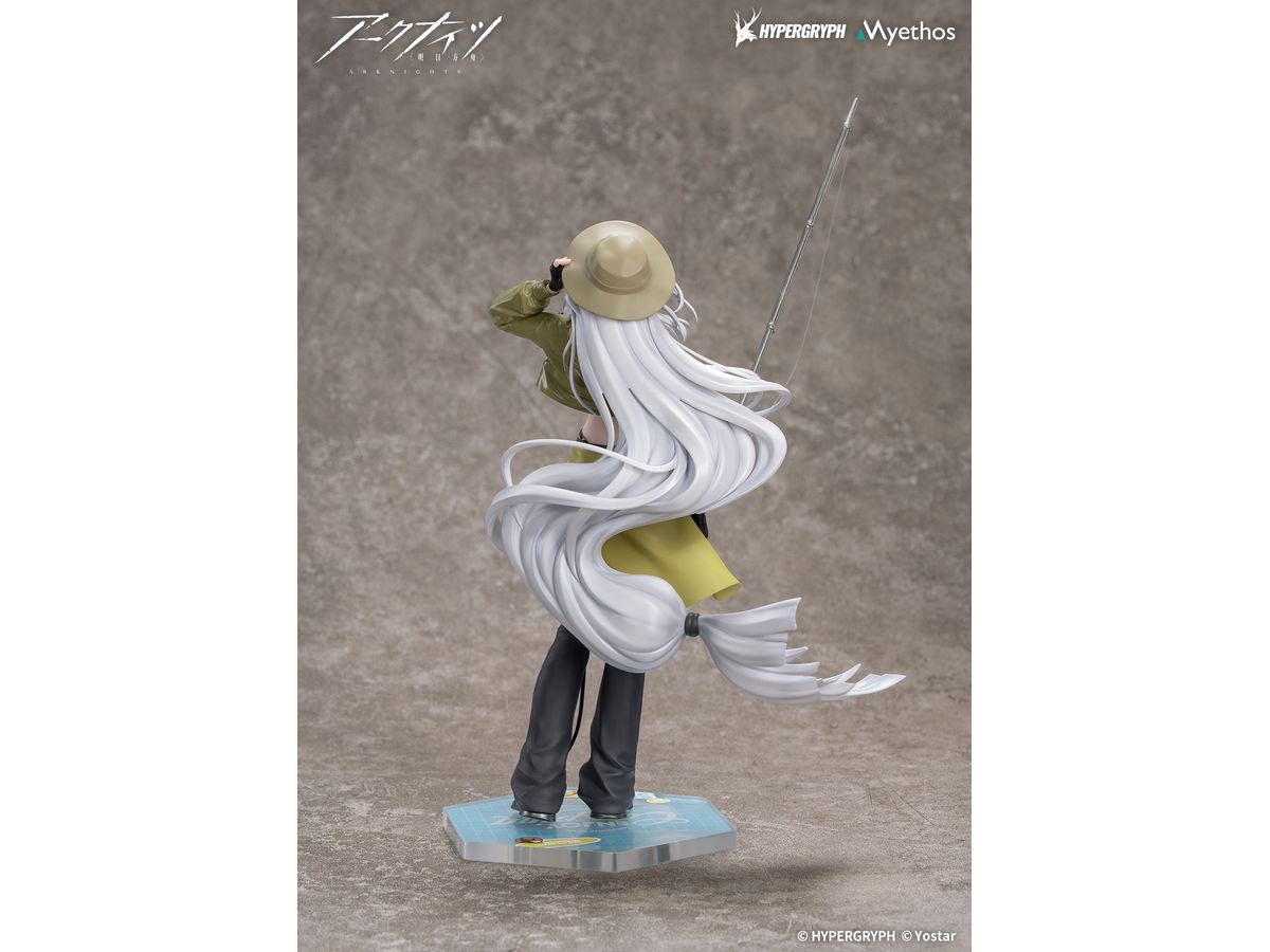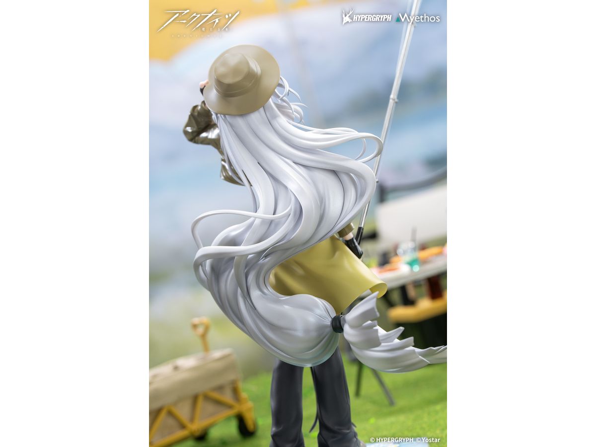 手にした釣り竿はリール部のラインのたわみまで精巧に作り込み、パール塗装を施した柔らかな長い髪は風になびき、美しいシルエットを作り上げています。