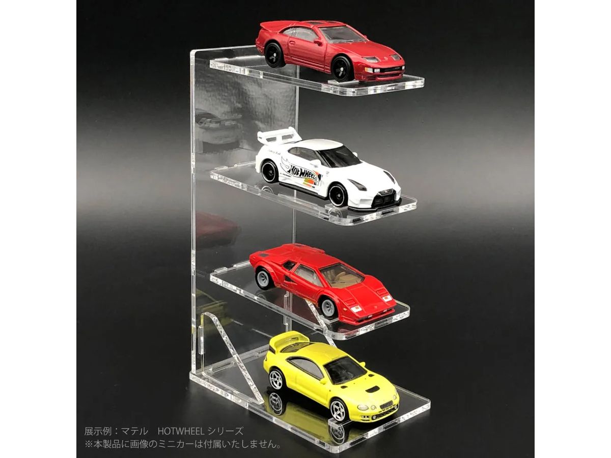 トミカやHOTWHEEL、マジョレットなどの3インチクラスミニカーを4台展示できるシンプルなタワーパーキング型ディスプレイ。