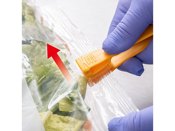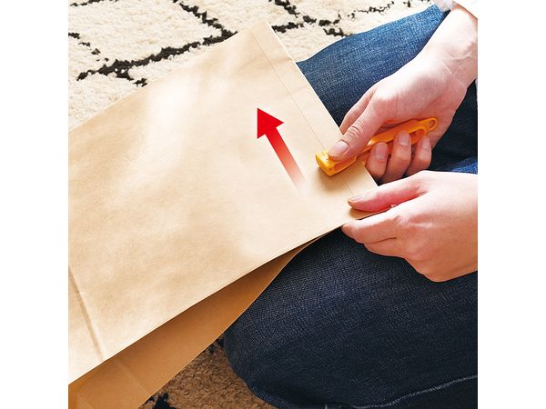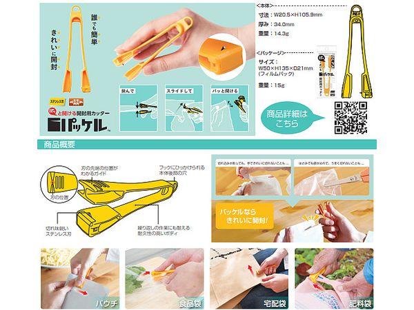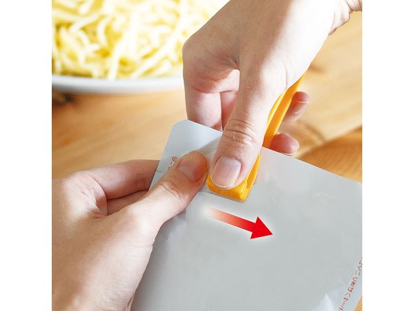 パウチ、食品袋、宅配袋など様々な袋類を挟んで切る開封用カッター。