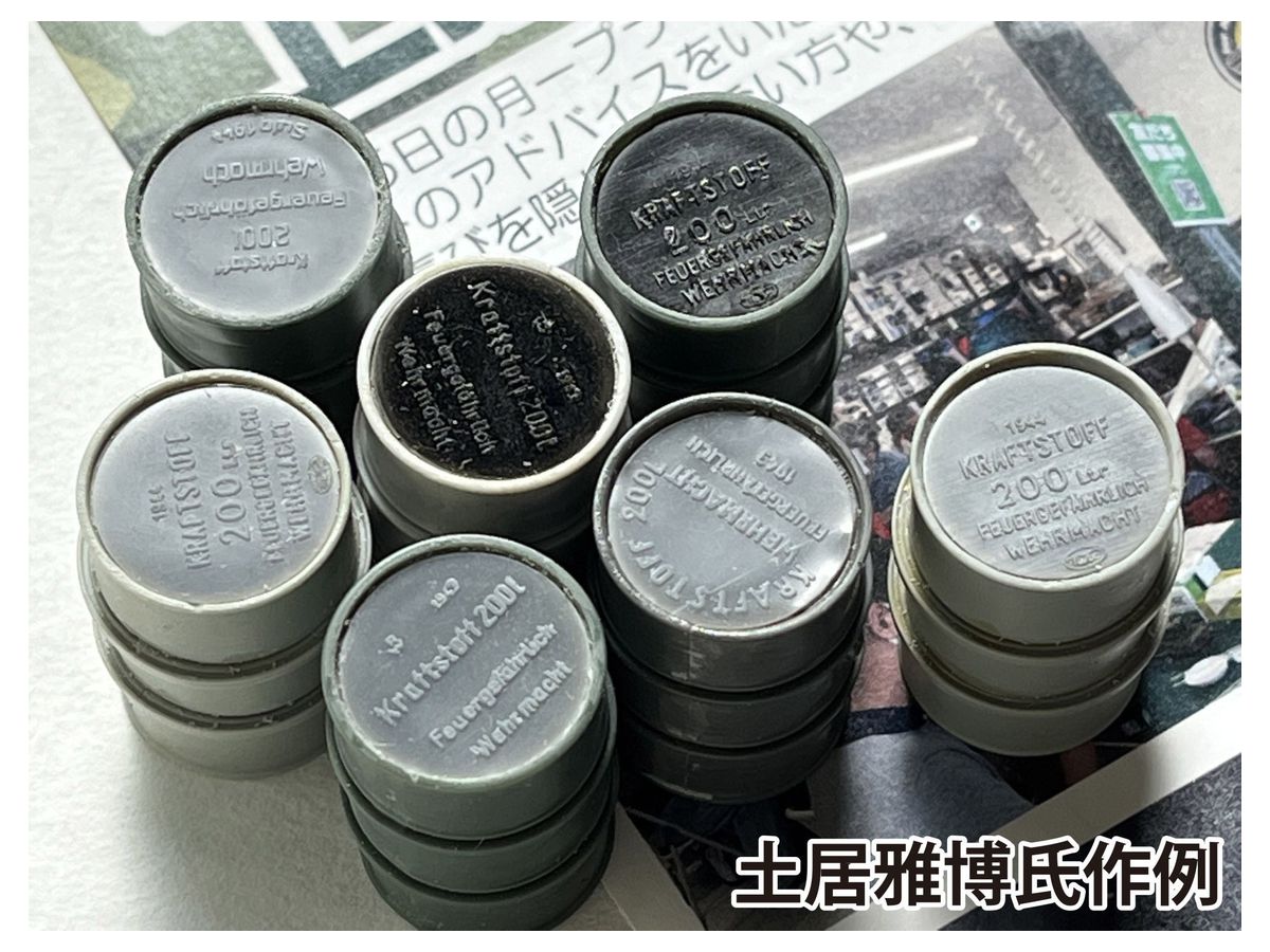 当初はディテールが判明したフタのみの生産予定でしたが、静岡のホビーショーでサンプルを手にした方々からは1941年6月22日に開始されたバルバロッサ作戦で活躍していた戦闘車輌の給油に使われた1939年から1941年までのドラム缶を登場させたい、製造年が刻印されている各々の年が欲しいとの声が多く寄せられました。