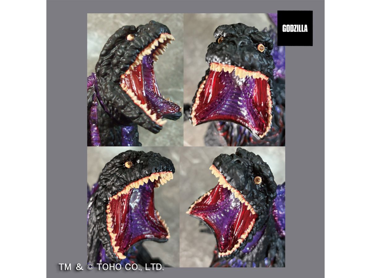 今回は、熱線放射シーンをイメージして紫の彩色のゴジラ本体に、新造形の下あごが割れた「熱線放射ヘッド」、そして新造形の「強噛みヘッド」が付属。