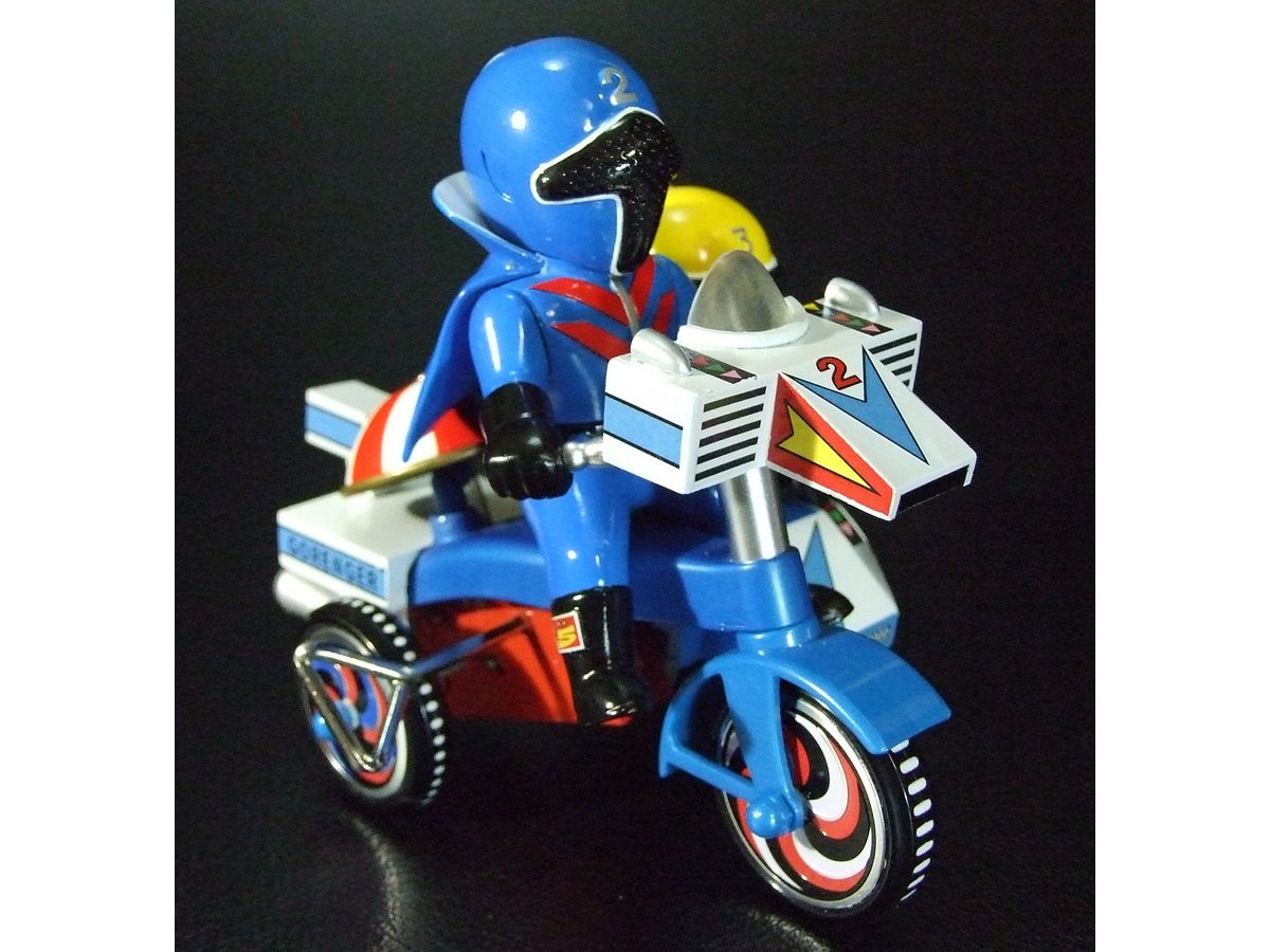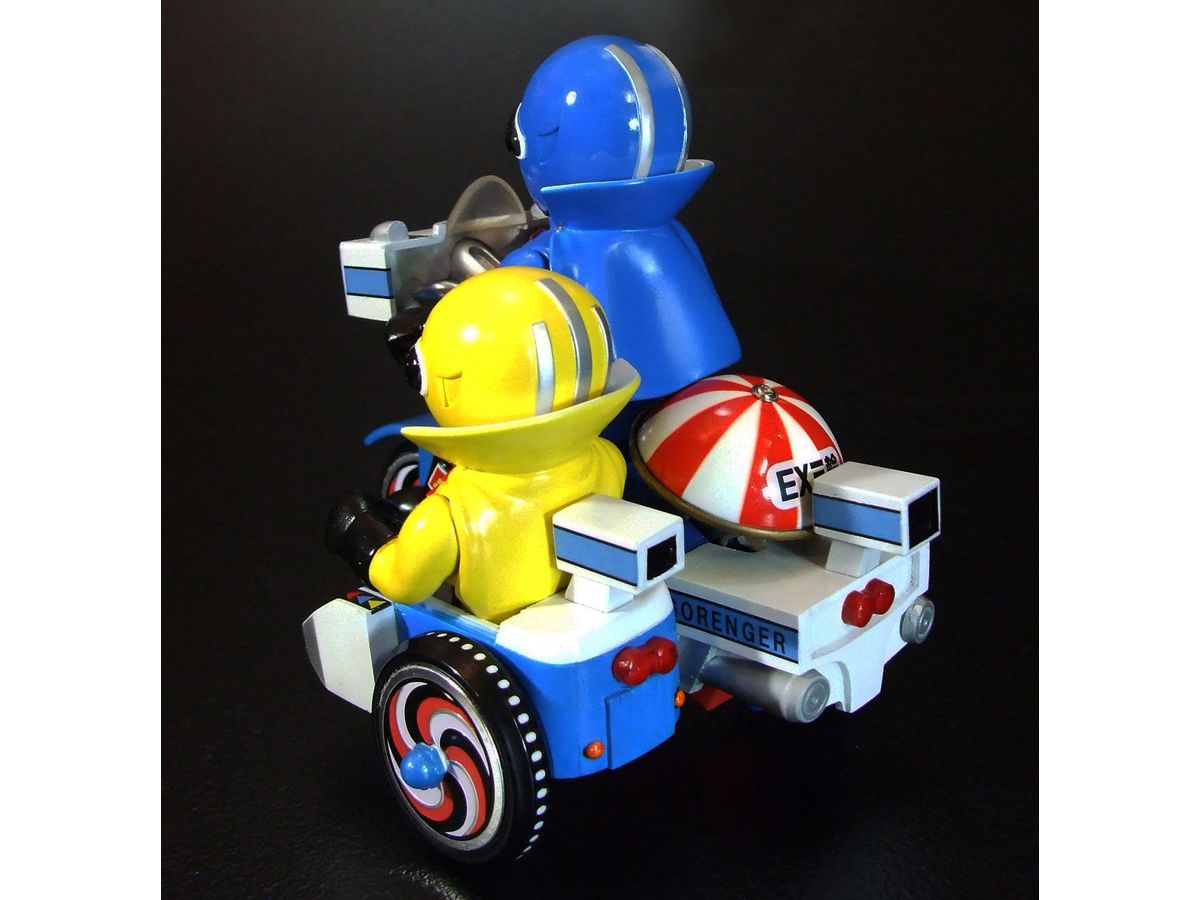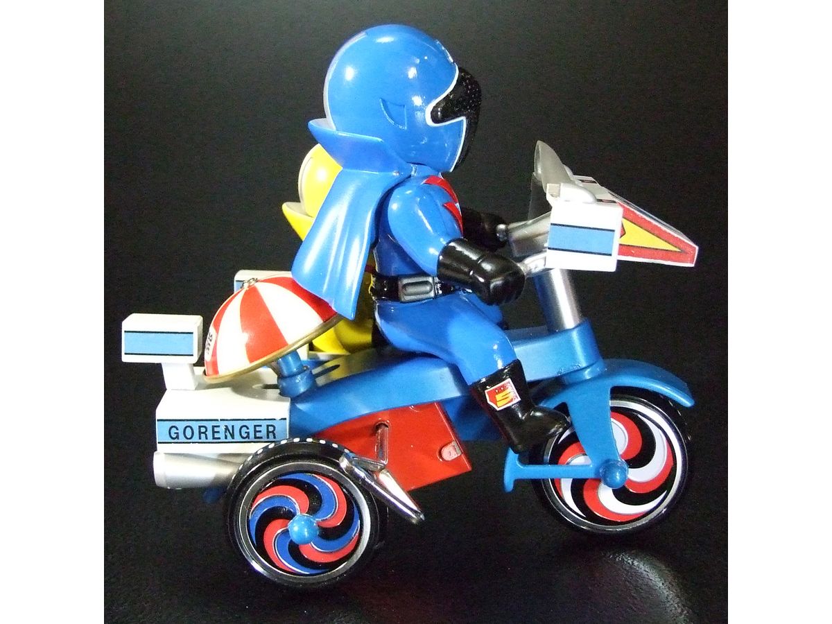 「秘密戦隊ゴレンジャー」に登場するキャラクターたちが、懐かしくレトロなゼンマイ式三輪車に乗ったソフビフィギュアで登場!!