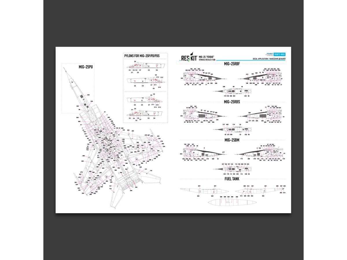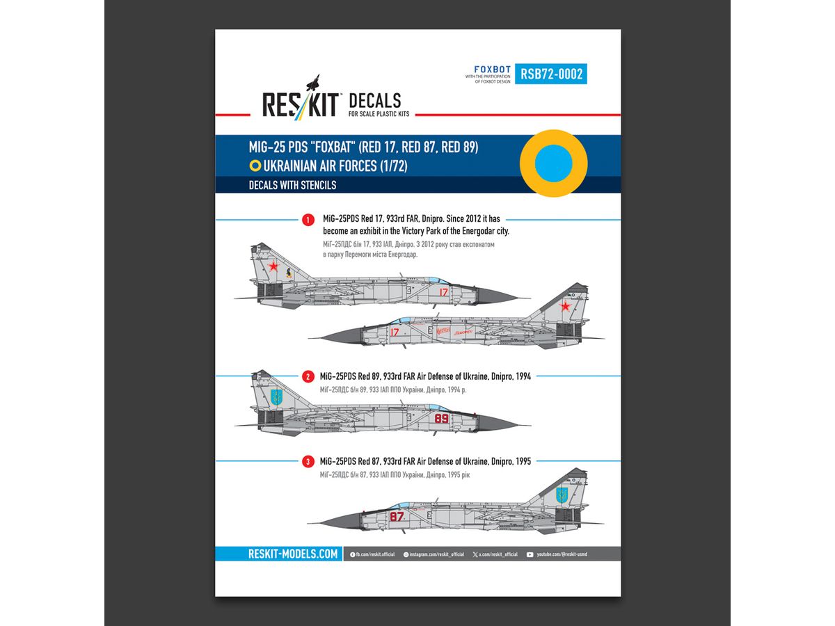 ウクライナのレスキットから、新商品の1/72スケール MiG-25 フォックスバット用デカールの登場です。