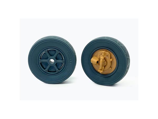 「リビア」タイプと呼ばれる接地面のトレッドパターン、ホイール形状、サイドウォールのメーカーロゴなどの細部も精密に再現しています。